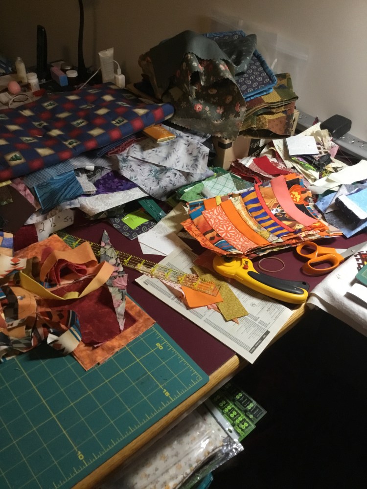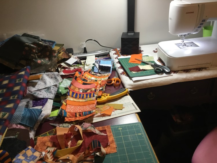 On my sewing table you can see the last of my fabric bits to make parts 1 – 4. I’m doing them as leader Enders (with a few extras thrown in) to keep the mystery going.