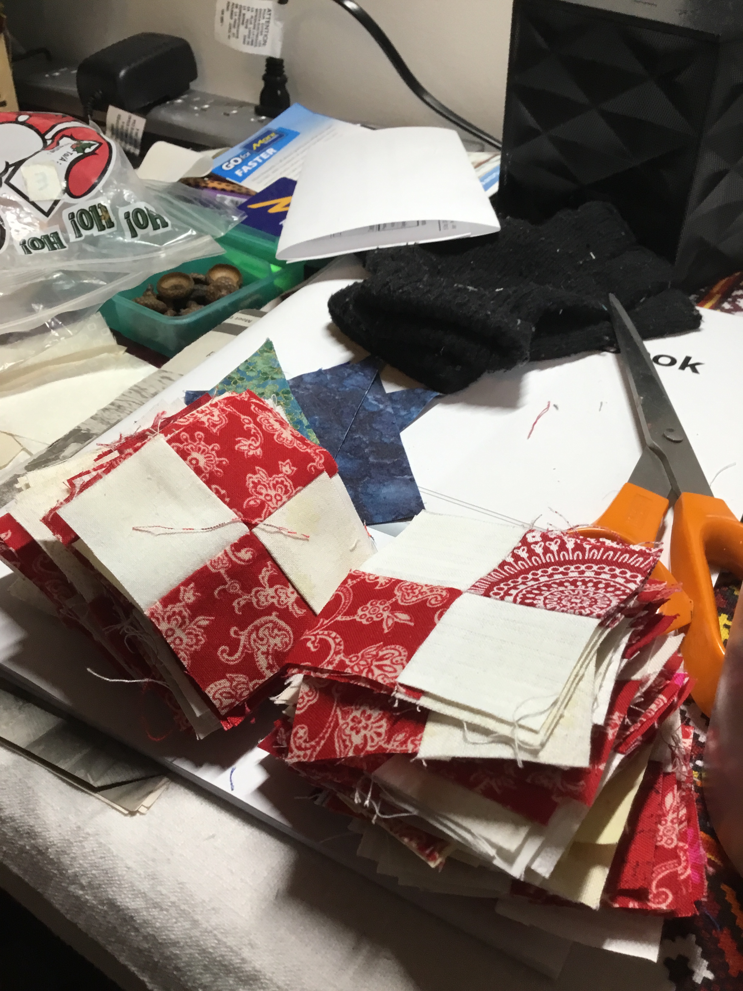 My year has begun with another unpack of my boxes and bins from the storage room to do another sort and purge! Since moving out of the house (3600 sq ft) in October and into a temporary apartment (600 sq ft) I have discovered I don’t have enough space to sort my already put together projects. My first order of business for the year has been to rearrange furniture and my sewing space to make room for a shelving unit to get me a bit more organized. The shelf is ugly but it’s what I had in the storage room and this is only until March when we move again!