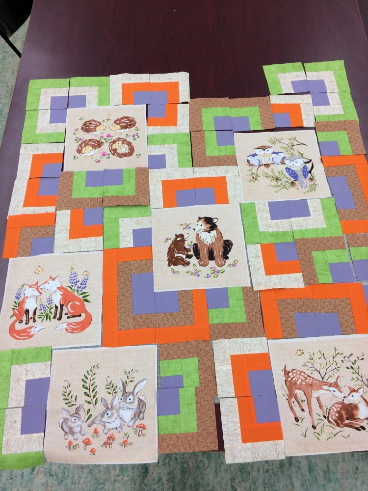 I laid out the quilt yesterday for my newest great grandchild. After checking the layout, I decided I need to make a few more blocks to cut up for spacers in between the baby animal blocks. I will try to get to them this afternoon. The borders are ready to go on but I think this quilt needs to be a bit bigger!