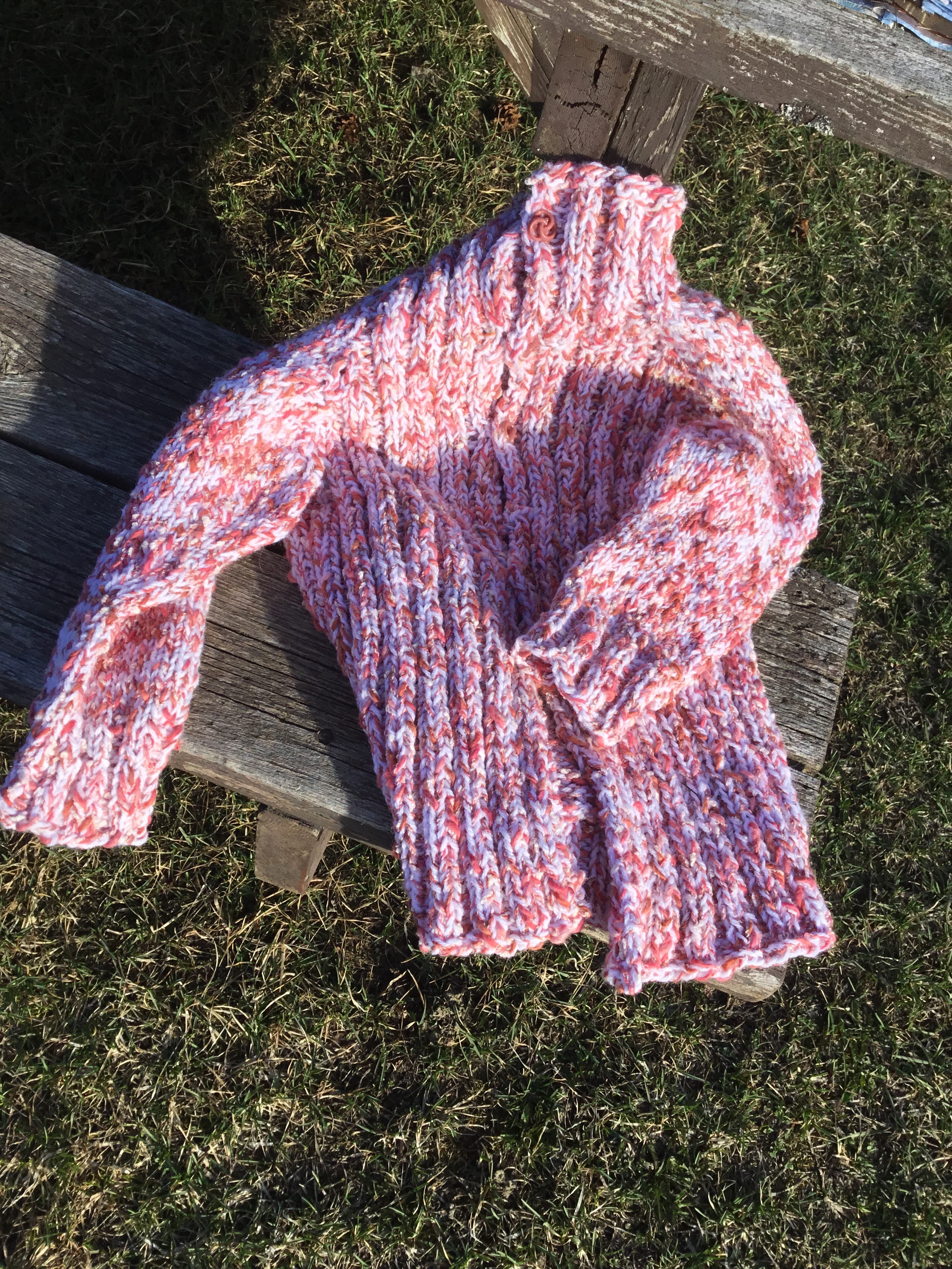 Next up is Ruby’s sweater. She picked out some pink wool. I guessed it would either be pink or orange for Ruby-Roo. That’s her favourite color choices. Can you believe they are made from the same basic pattern? It is so much fun to play and modify them!