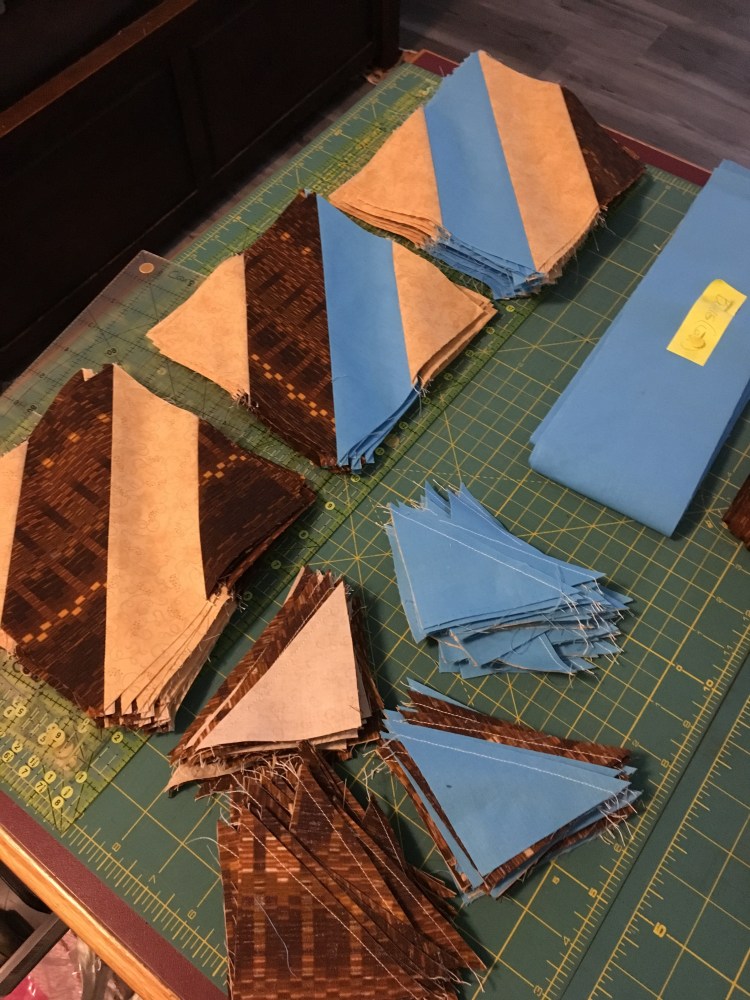In between getting that done and waiting for my basting spray to dry, I was working with some of the almost 300 hst’s I made yesterday for the secret sewing I am doing.