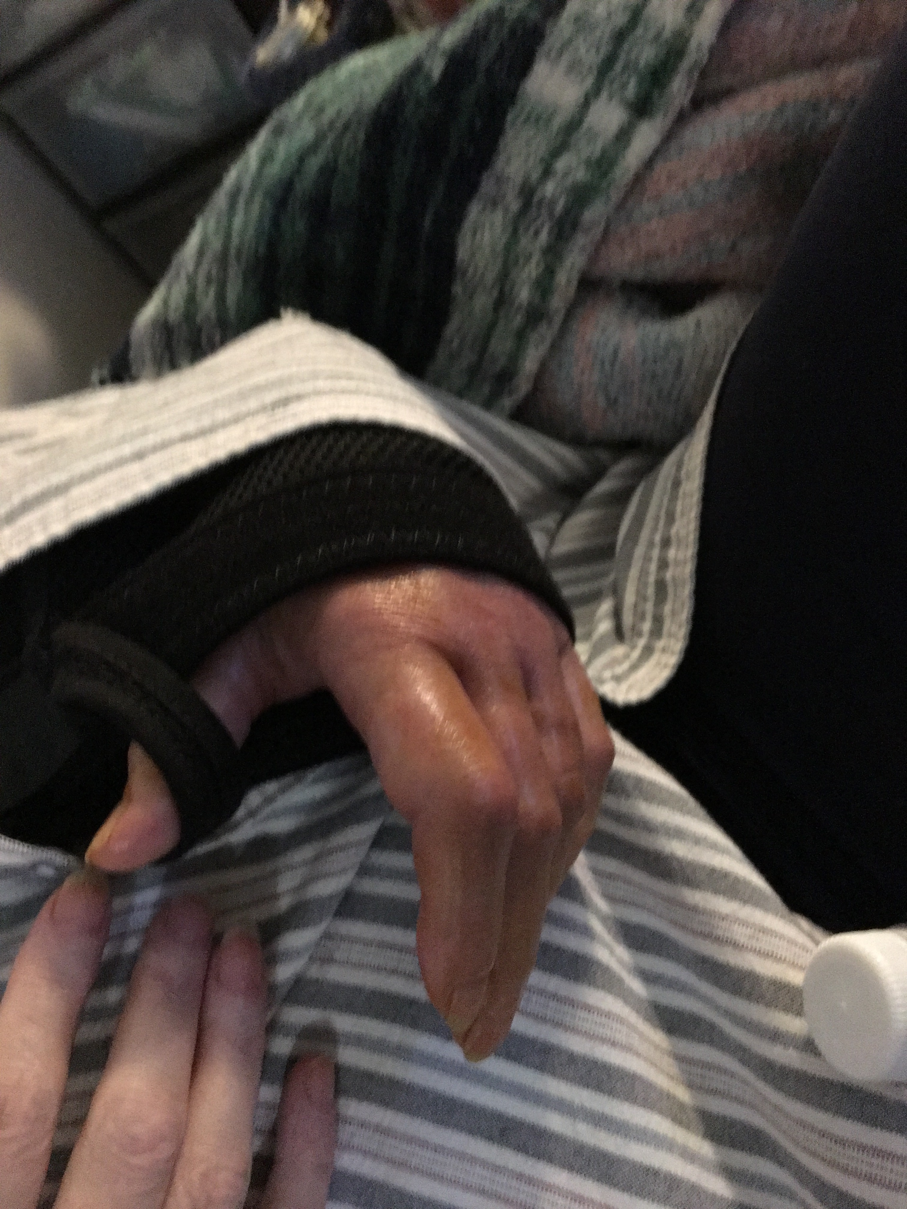 My hand was 4 times normal size, purple and numb! An hours trip to town to the Emergency Department and a wonderful ER doctor later, the tensor was loosened and Shot given for pain. After 3 hours the hand started to recover feeling and swelling was found down. The doctor sent me home. Thursday morning at 7:30 the doctor called me to make sure I had The tensor put back on. I got a friend to help since DH can’t use his right hand.