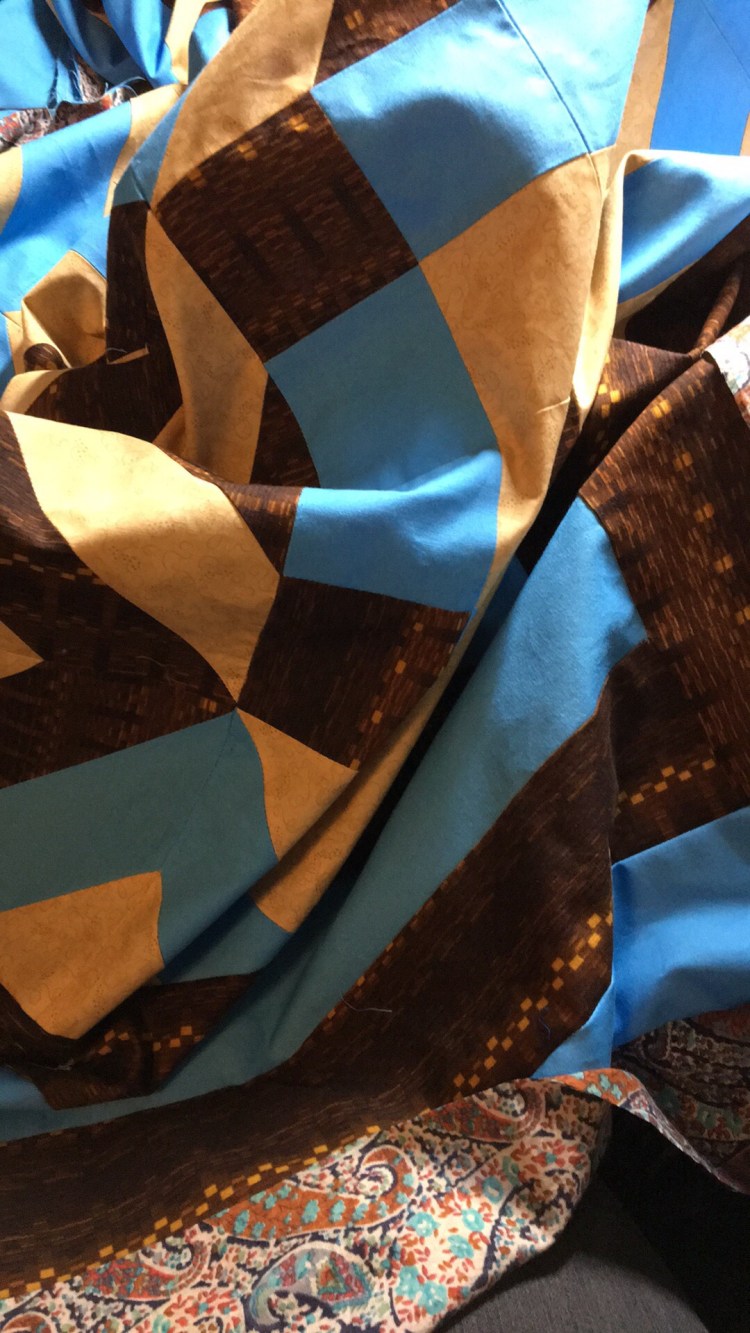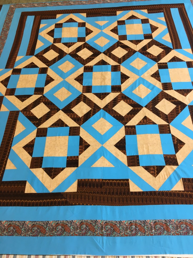 I was distracted when I was finishing cutting my borders by a telephone call from my son who had just arrived home from Saudi Arabia and didn’t realize it until I started piecing the last borders that I had made an error. I had to scrounge around in the stash to find the paisley fabric which went with the colours in the quilt. I’m telling myself it was a subconscious design flaw so I could use the paisley since I do love this fabric.