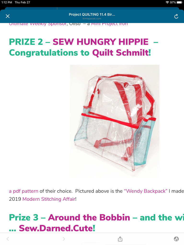 I won third prize which was a credit for pdf patterns from Sew Hungry Hippie but the hard part was making a decision from Natalie’s incredible patterns! I have been searching for new patterns for some charity quilts and Natalie had 2 which just might work. I can’t wait to play with fabric and try these new projects!