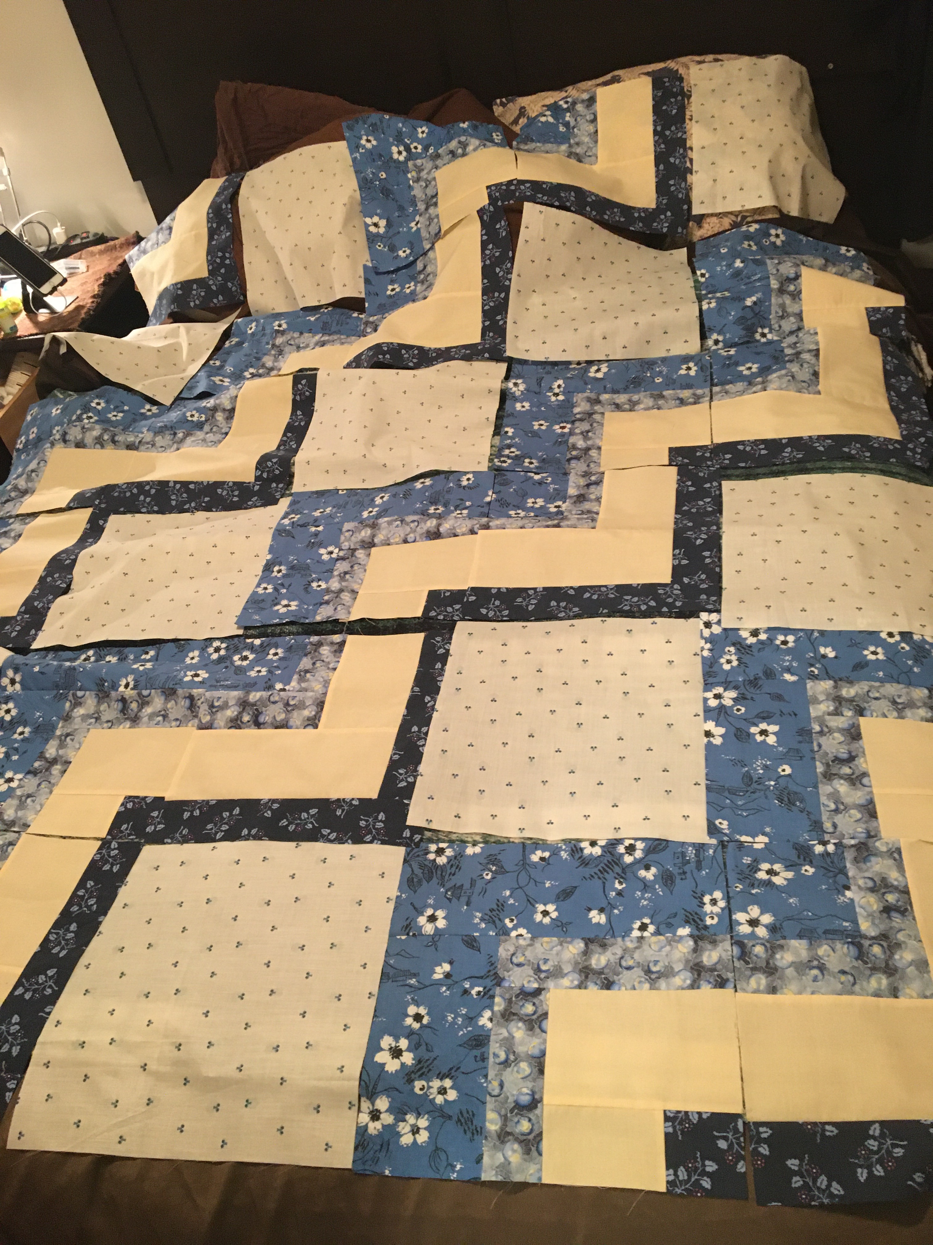 The blocks were put together over two days of sewing in between real life chores. I no longer have a design wall set up so laid the blocks out on our bed to ensure I had everything right.