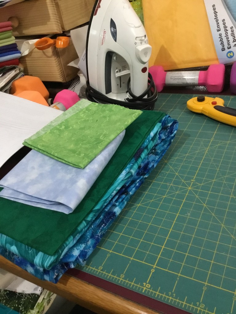 When I first started playing with fabric and my machine, I started purchasing fat quarters. Then I moved out of the north and was working two jobs and had plenty of disposable income. I then started buying yards of fabric if it caught my attention. I didn’t pay much attention to colours or hues. The fabric went into the cupboard. Then I decided that 3 yards was the best amount to add to my stash. It usually works out that 3 yards will work for one of the fabrics in my desired pattern. Now with being retired on a fabric diet I’m trying to work with my stash. I will admit to being a bit surprised with some of those early fabrics. My tastes have definitely changed. Now I will purchase fabric in a needed amount for a quilt or occasionally I will buy 4 or 6 fabrics from a particular collection if it has that “you need to take me home” tug at my heart. I tell my students they will have to decide which method works for their life, budget and space. Going from my 14’ x 24’ studio to 4’ square of sewing space I keep my purchases to a minimum.