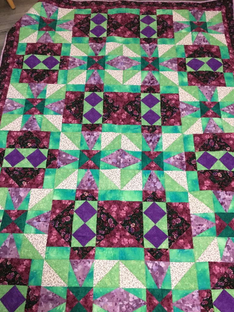 I like the fact that I did finally finish one of my UFO’s. Spring Into Summer is not only quilted but bound as well! I had fun doing stitch in the ditch, some ruler work and FMQ flowers and squiggly lines in the border. It has been so cloudy and rainy here I haven’t been able to get some good photos of the quilting on the top.