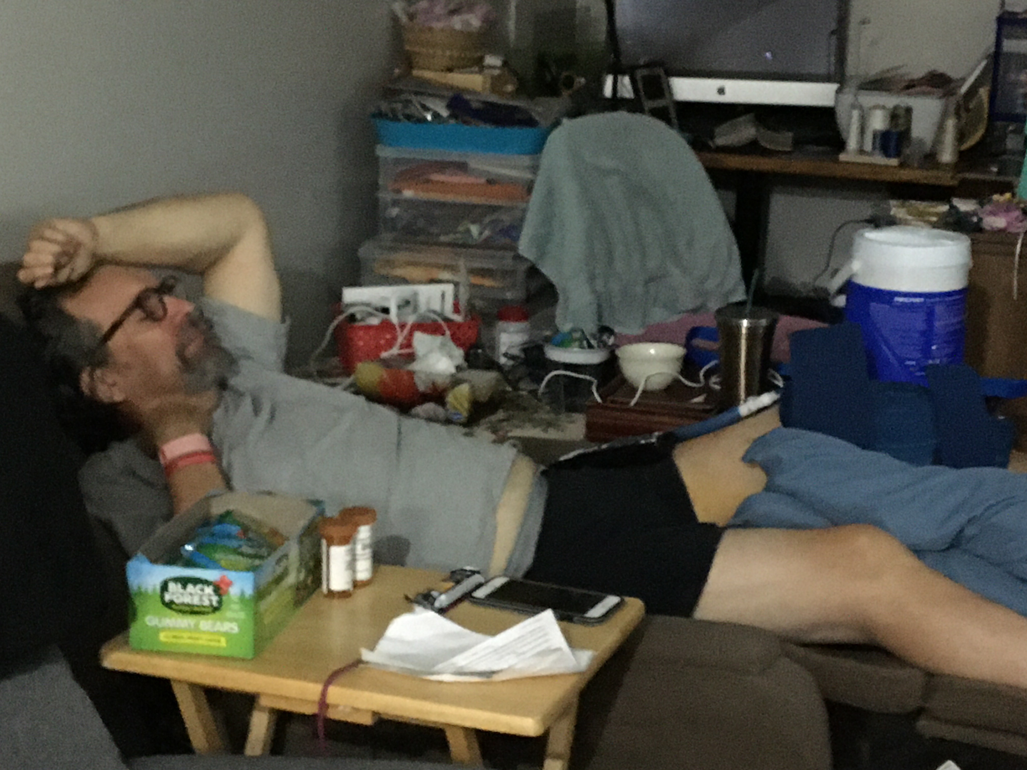 It was a chore to get DH in and out of the car and such a relief to have him home. He was moving and able with our help to get to the washroom. He settled in for the night after a snack