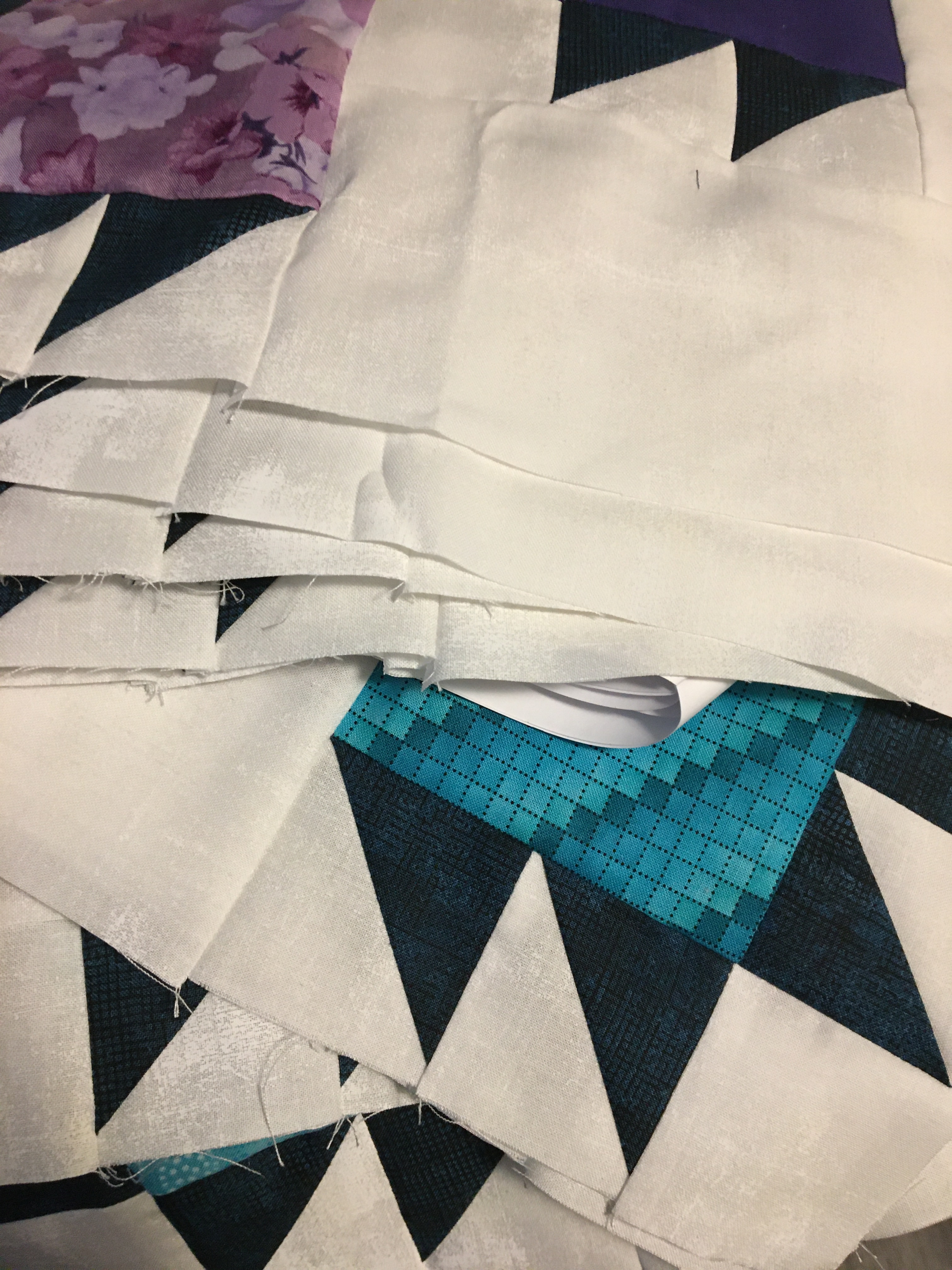 The pops of purple make this quilt really sing! Amazing! Luckily my sewing machine is in a different room from either television. And DH has headphones so I can’t hear the things I don’t want to watch!