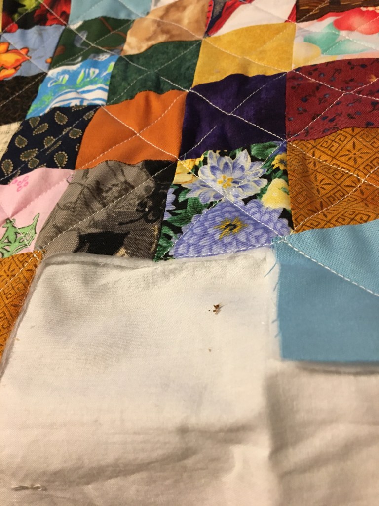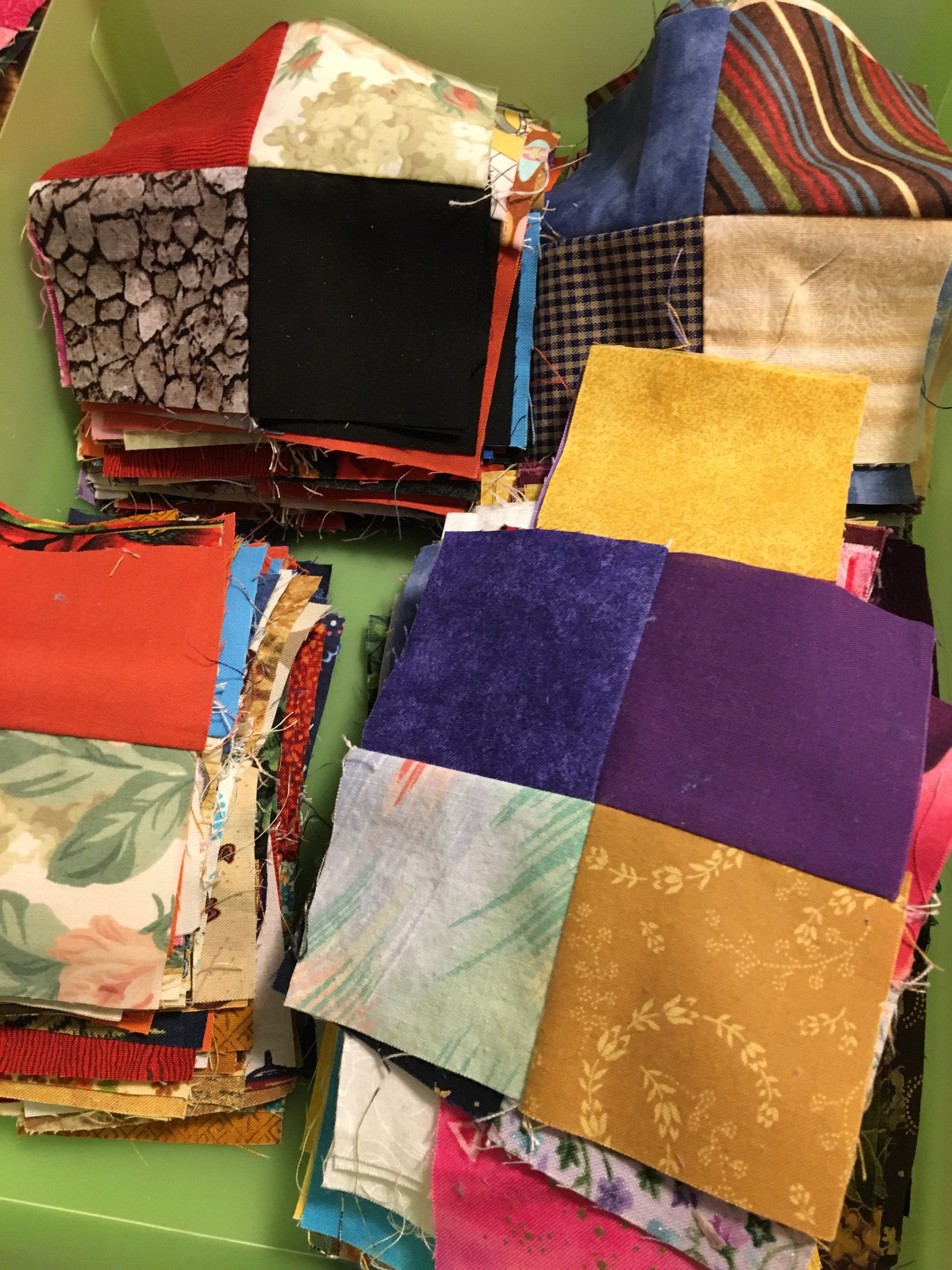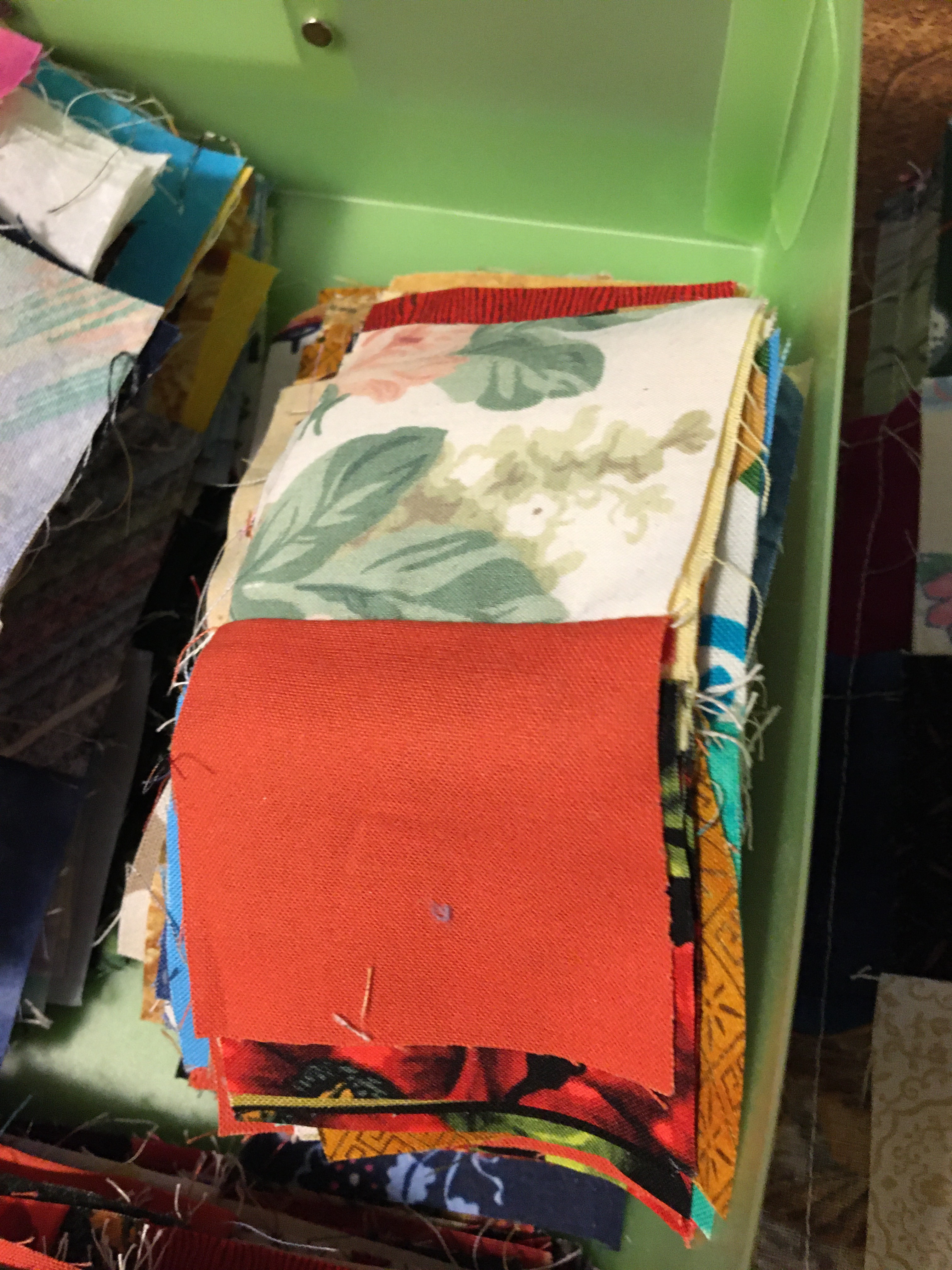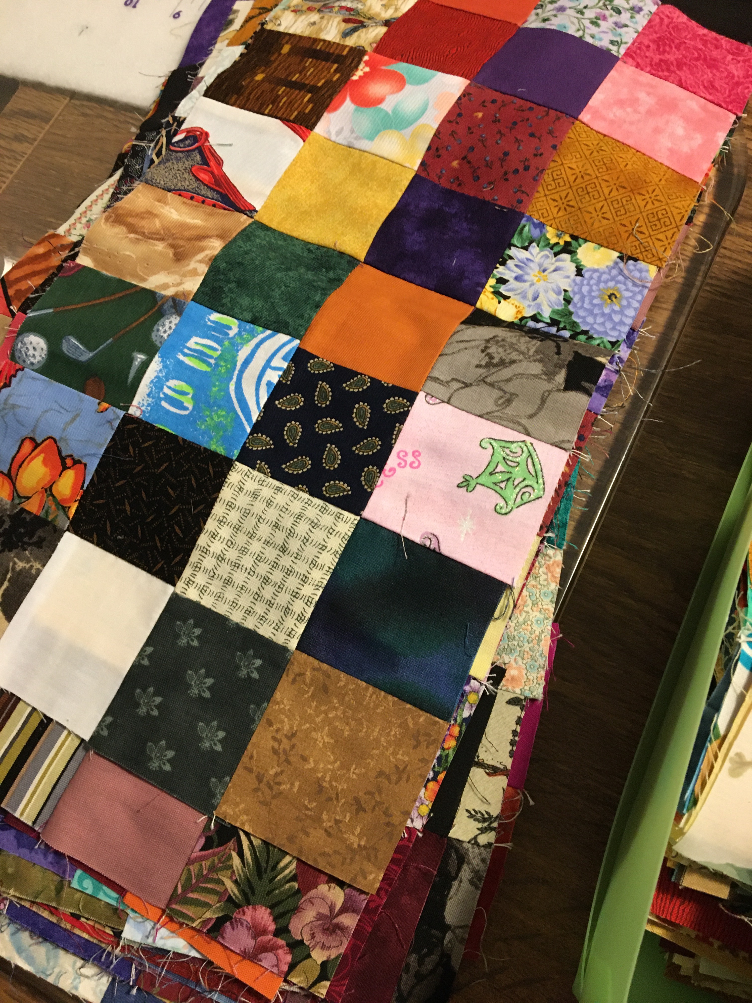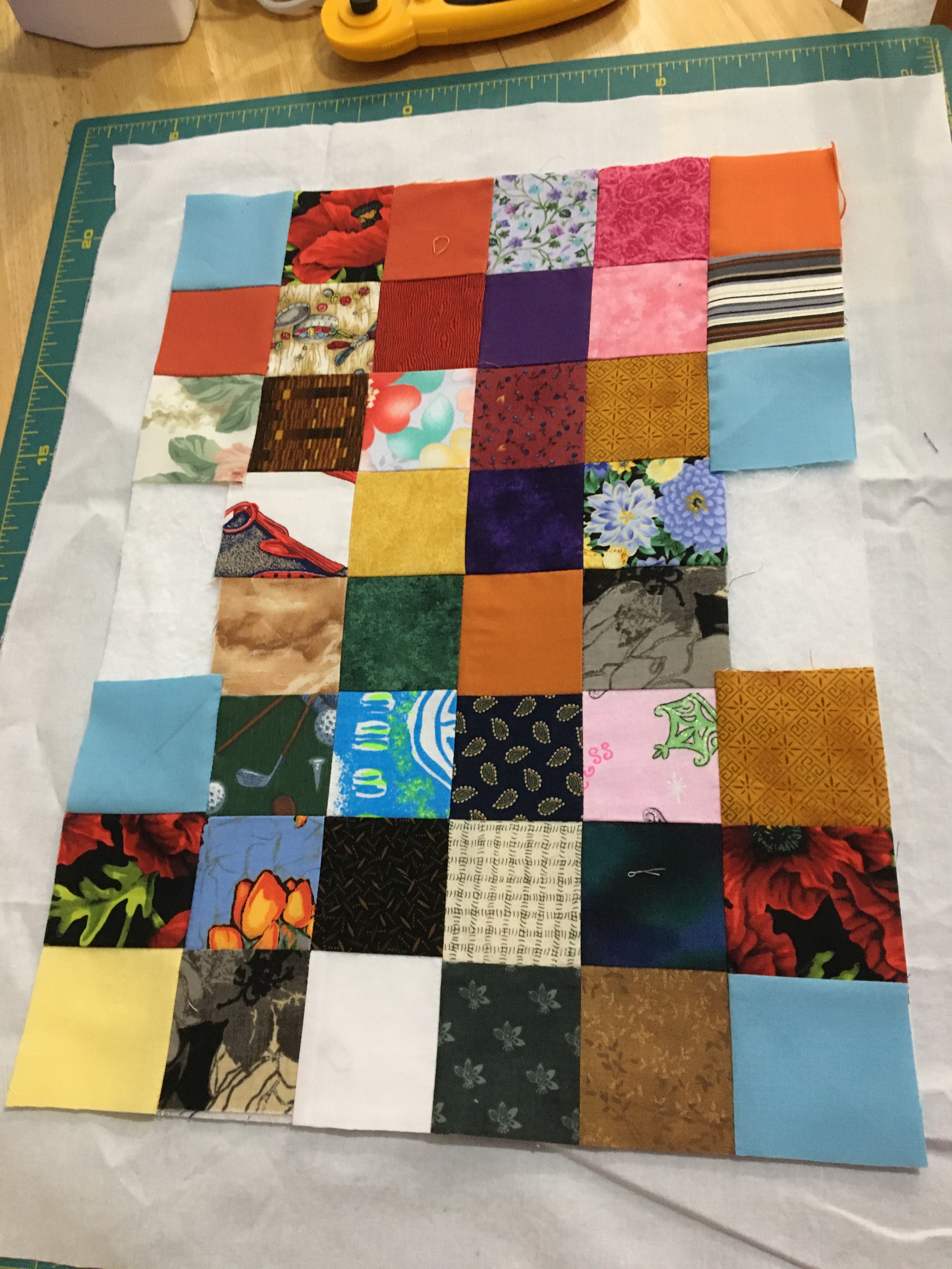 I start by making my panel for the bag. Usually I do a QAYG panel with a normal backing/batting sandwich but recently I was inspired by Gail’s post on her Charm Bag project to use leftover 2 1/2” squares to make my panels.