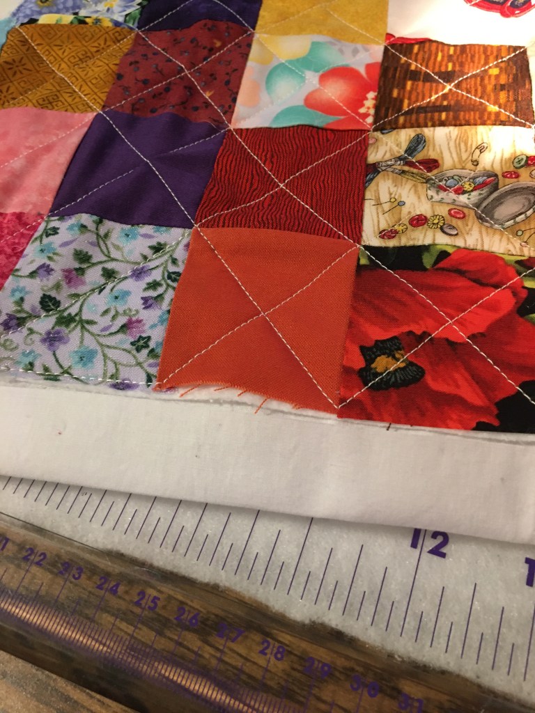 I then sandwich the panel with batting and backing. The backing becomes the lining for the bag and is trimmed to leave 2” on all sides. The panel is quilted and I trim the batting back to the edge of the panel/front of the bag.