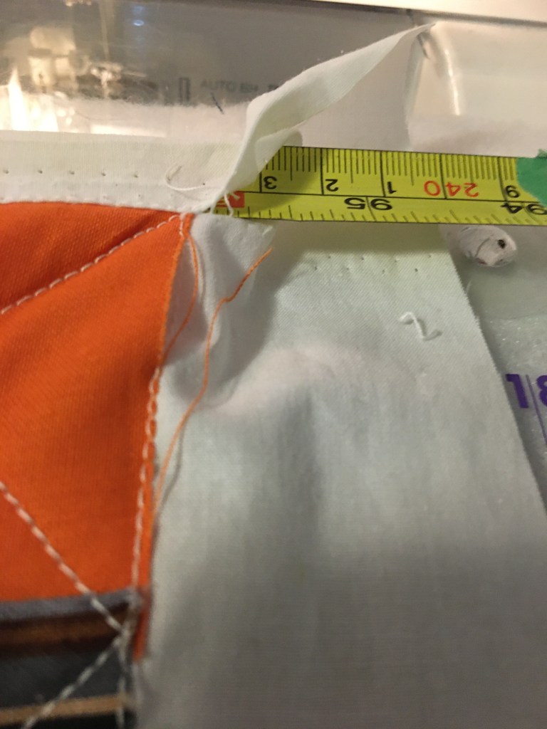 Once it up is sewn I insert the measuring tape strips which have painters tape wrapped around the ends so the tape doesn’t put holes in the fabric.
