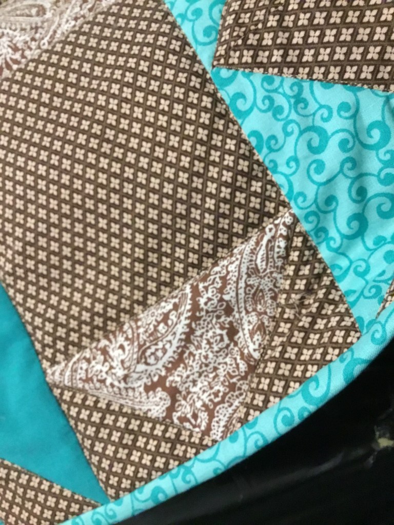 This pattern is another example of how well Becca writes patterns. The directions are clear for cutting and piecing. I loved the fact that you can choose which size of quilt to make just by changing the size of the blocks. The crib size finishes at 36” x 45” and is what I made. A friend needs a baby quilt for her soon to arrive grandson. The nursery is accented with teal in a beautiful log home. The fabrics were easy for my friend to choose from my stash!