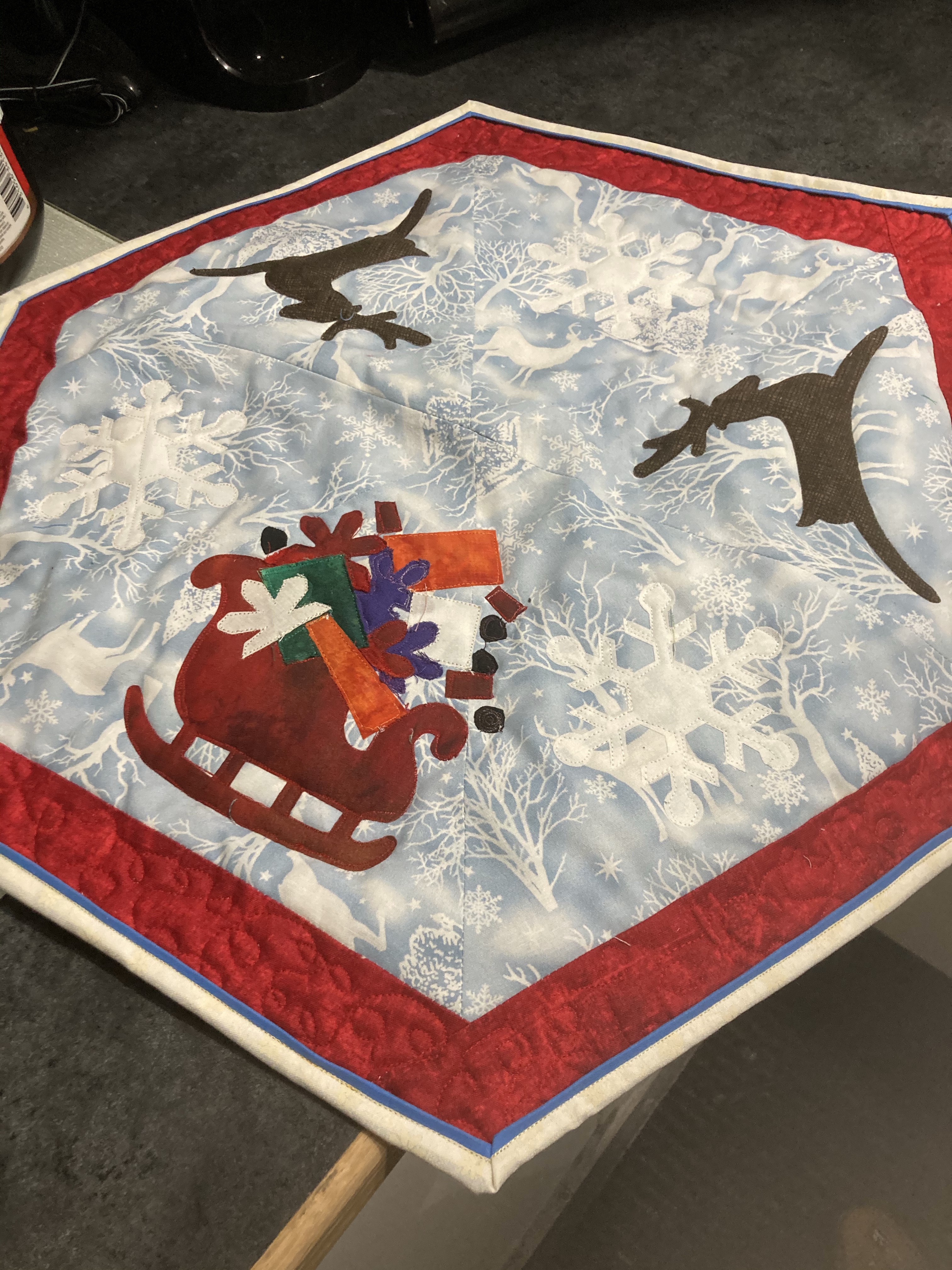 I also tried something I have never done before. I was inspired by Gail from Quilting Gail to do a flanged binding. I did the quilting on a hexagon Table Topper and thought the flanged binding might be the perfect finishing touch.