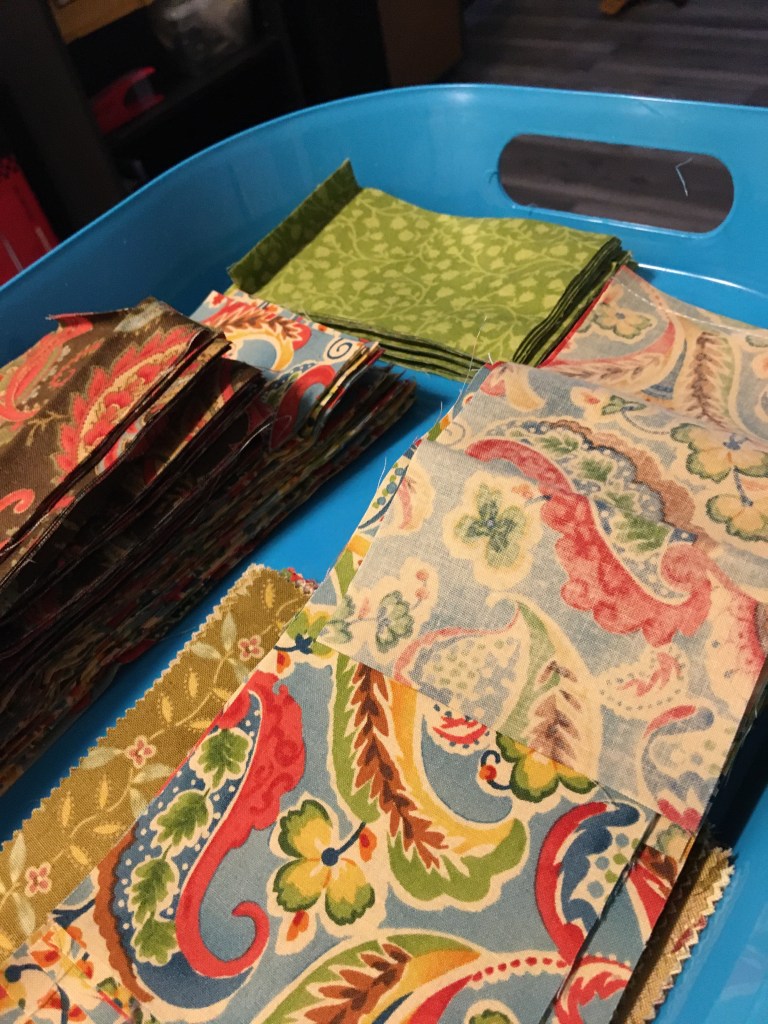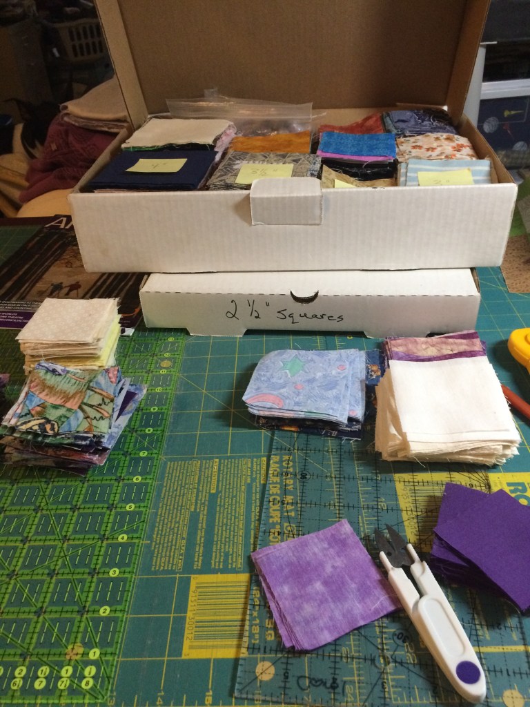 This pattern does use 5” squares so I pulled out all of the charm squares in my scrap user system (unused pizza boxes) that would coordinate with these fabrics.