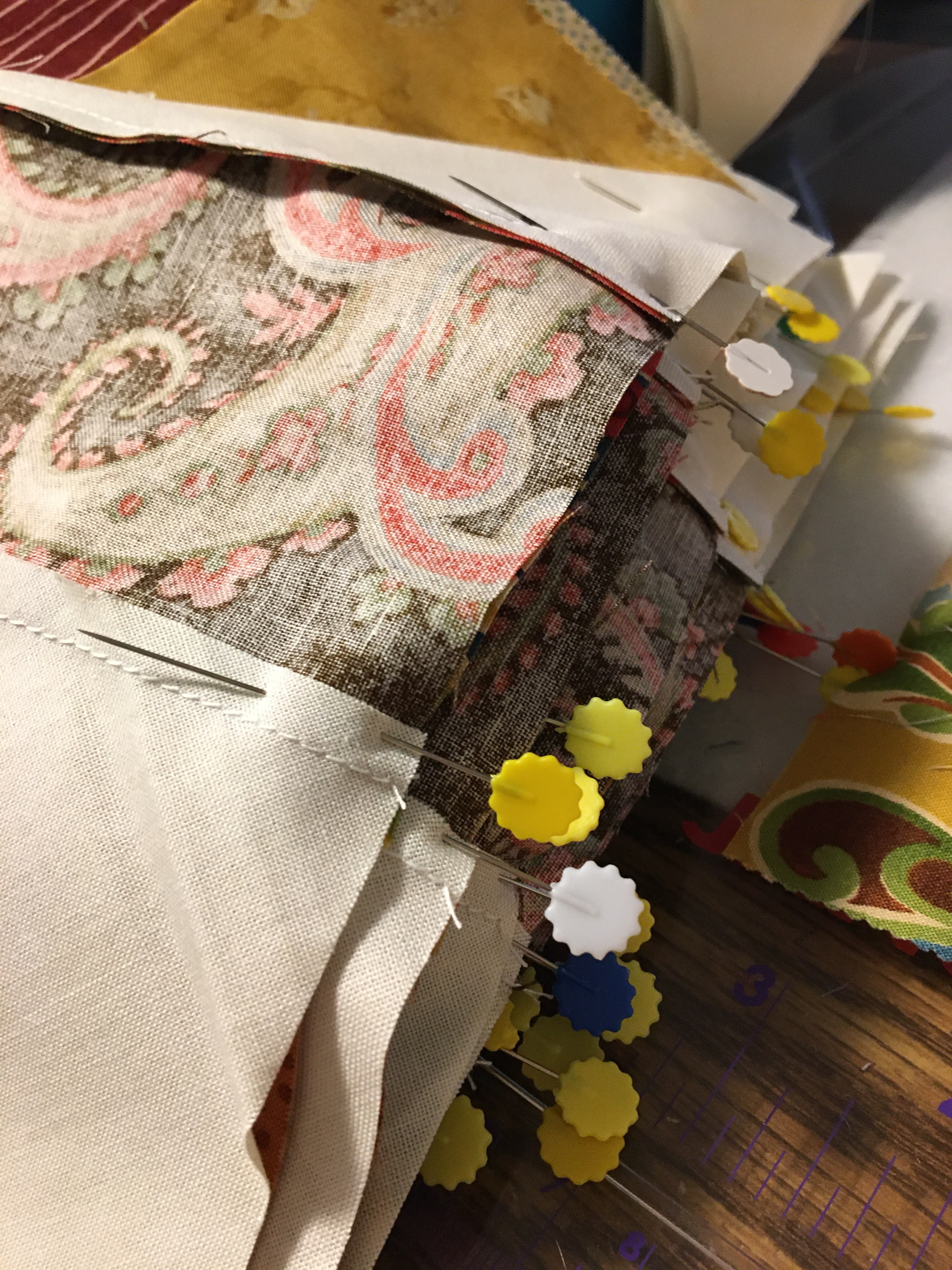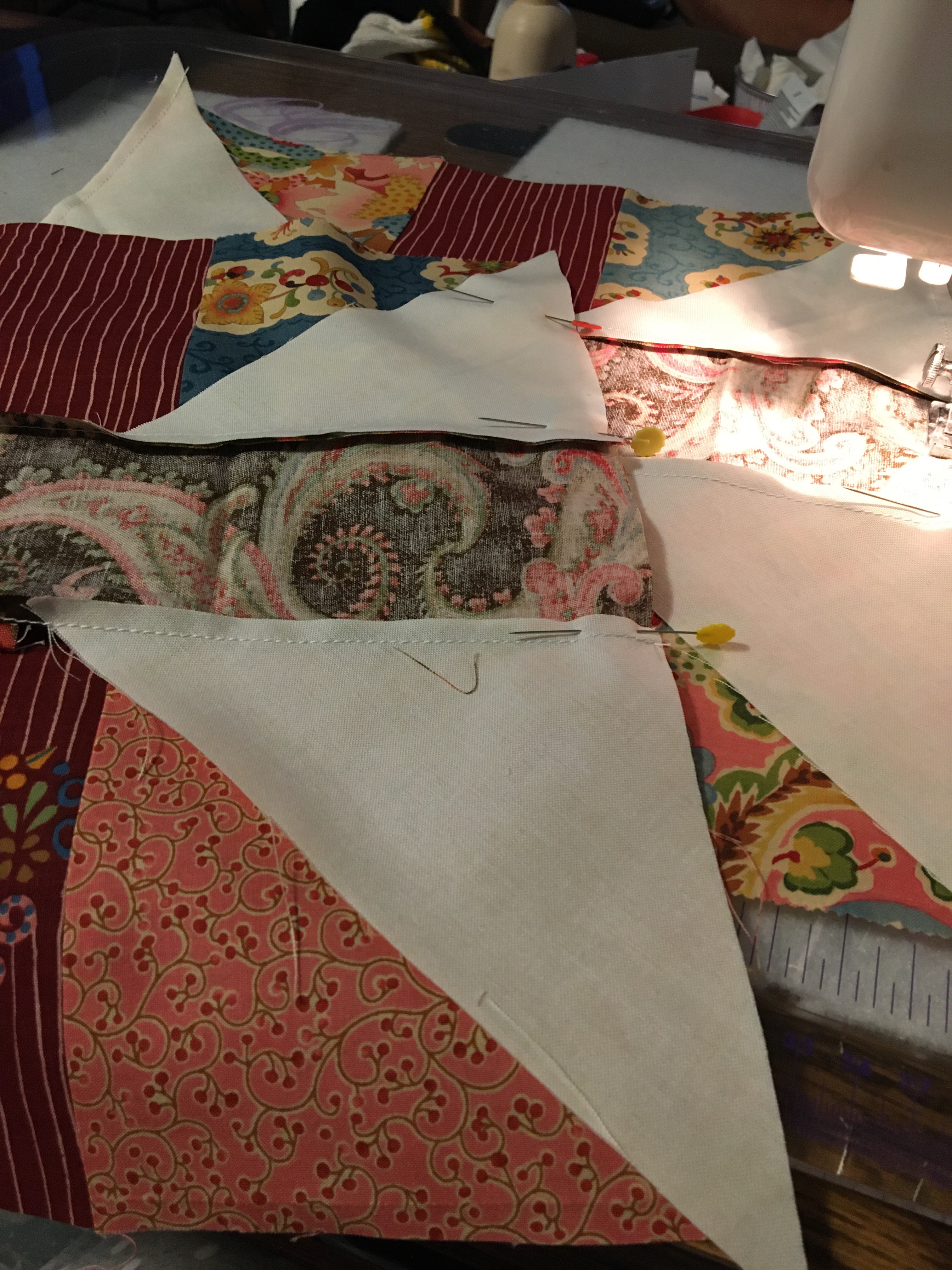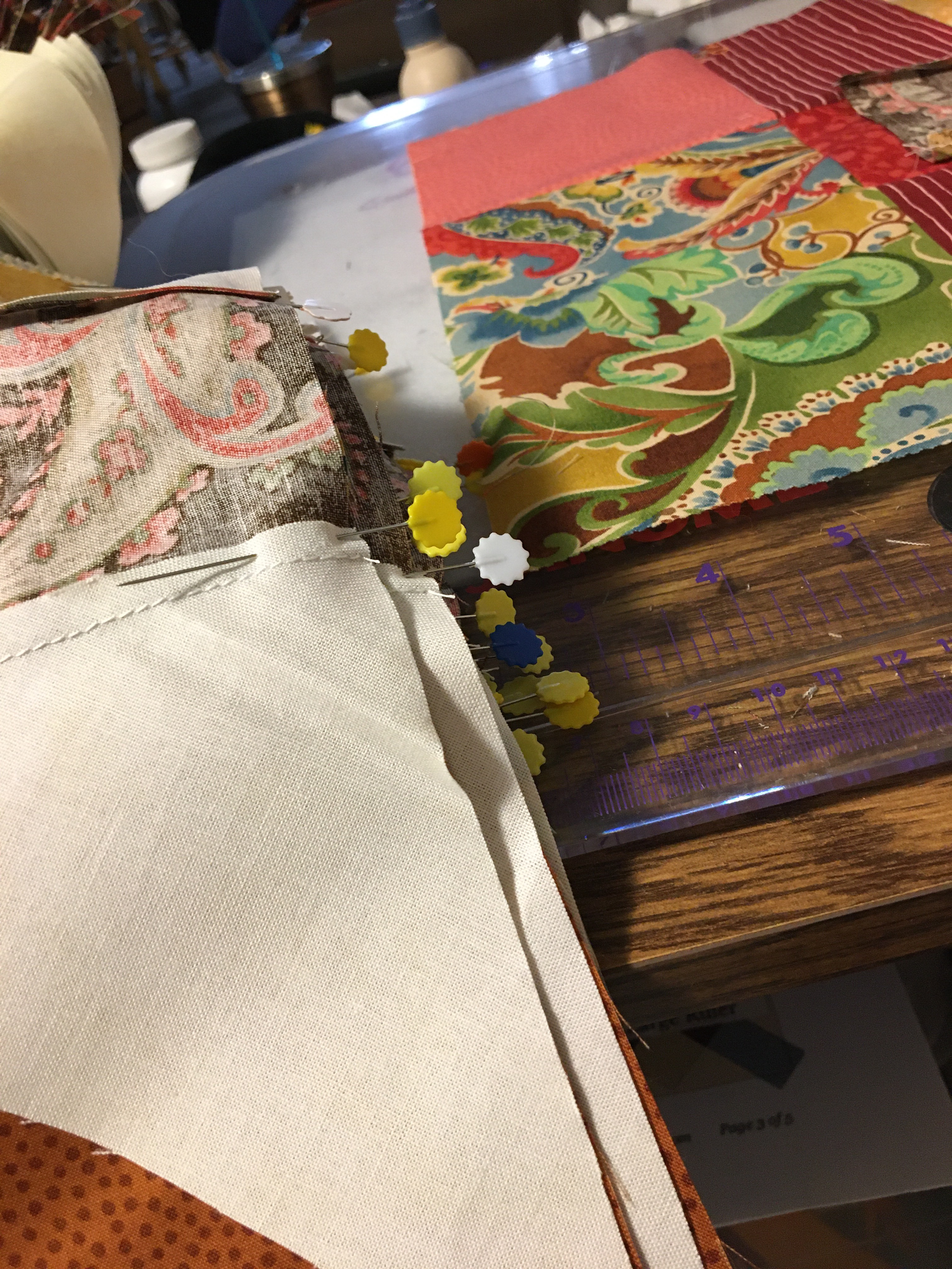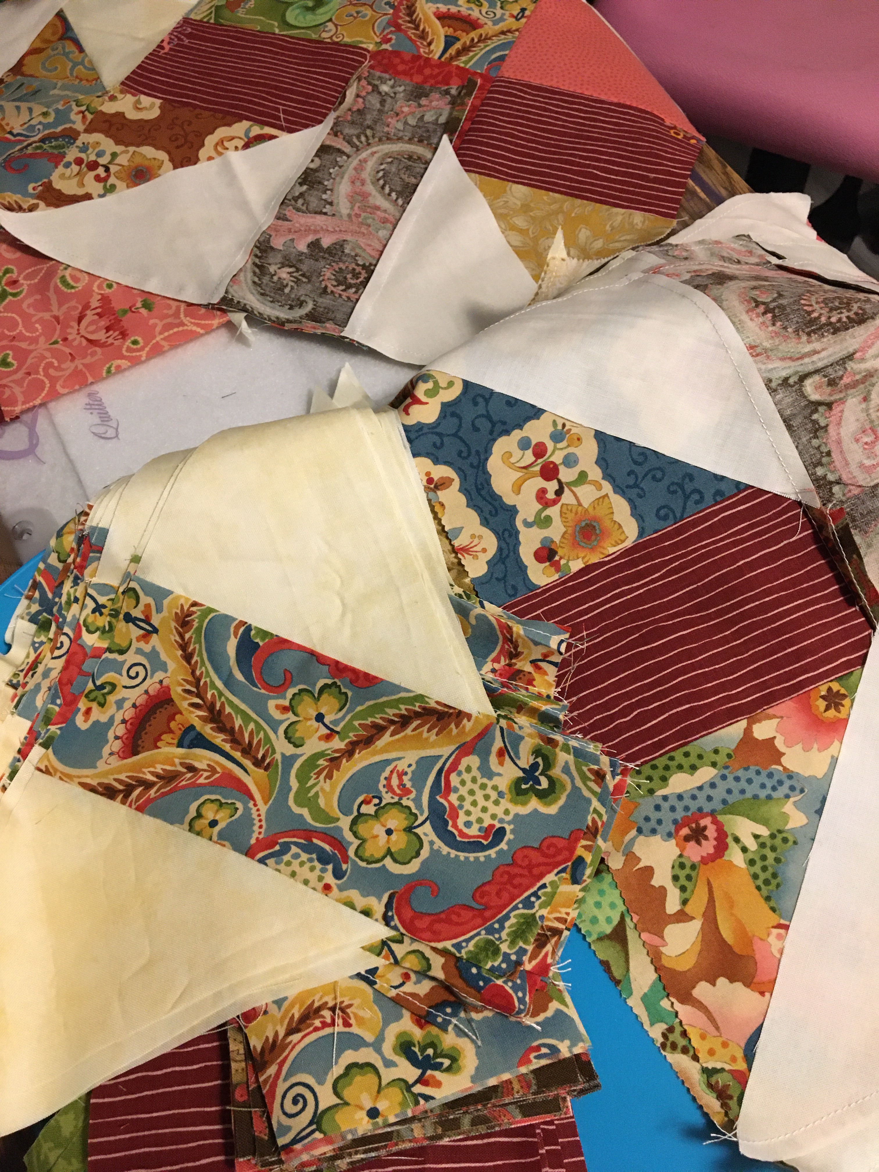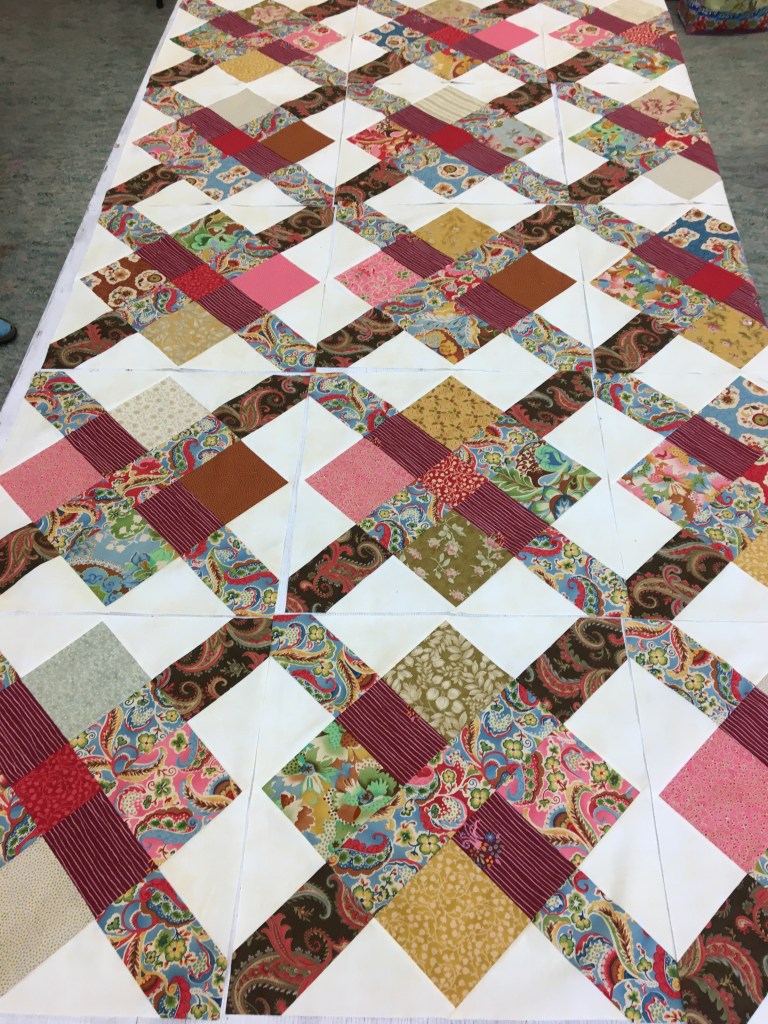 Once I decided what I wanted to do with this quilt top, (sorry Kris, I had to change it) I decided to not add the borders. I am adding a backing to it (no batting), will do some stitch in the ditch to stabilize it, and then assembled it to make a duvet cover with a zipper opening. Where we live we are often subjected to long power outages in the winter so I keep a down duvet on my bed. I’m so happy that next winter I will have a quilt on my bed that I made.