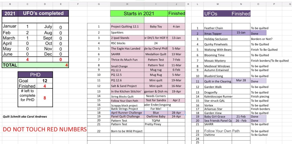 Great job, Carol! Your panel challenge is really pretty. I know you’ll be happy to be able to quilt it! I have trouble avoiding the squirrels, but anything works that will help get my mo-jo back! Just doing baby steps myself. Our governor did away with mask mandates on 4/9, and all restrictions will be lifted at the end of this month. So glad!