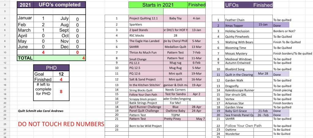7. Write my post for the scrappy quilt after I finish making the test blocks since I decided to try it with 2 1/2” squares as well as my original 2” squares. Writing the pattern is an official UFO since I have been making a concerted effort to finish writing all of the pattern for quilts I designed and liked the finished products. Pattern is written, Test blocks made using both 2” and 2 1/2” squares and the pattern is now posted on my Pattern Page. 😄