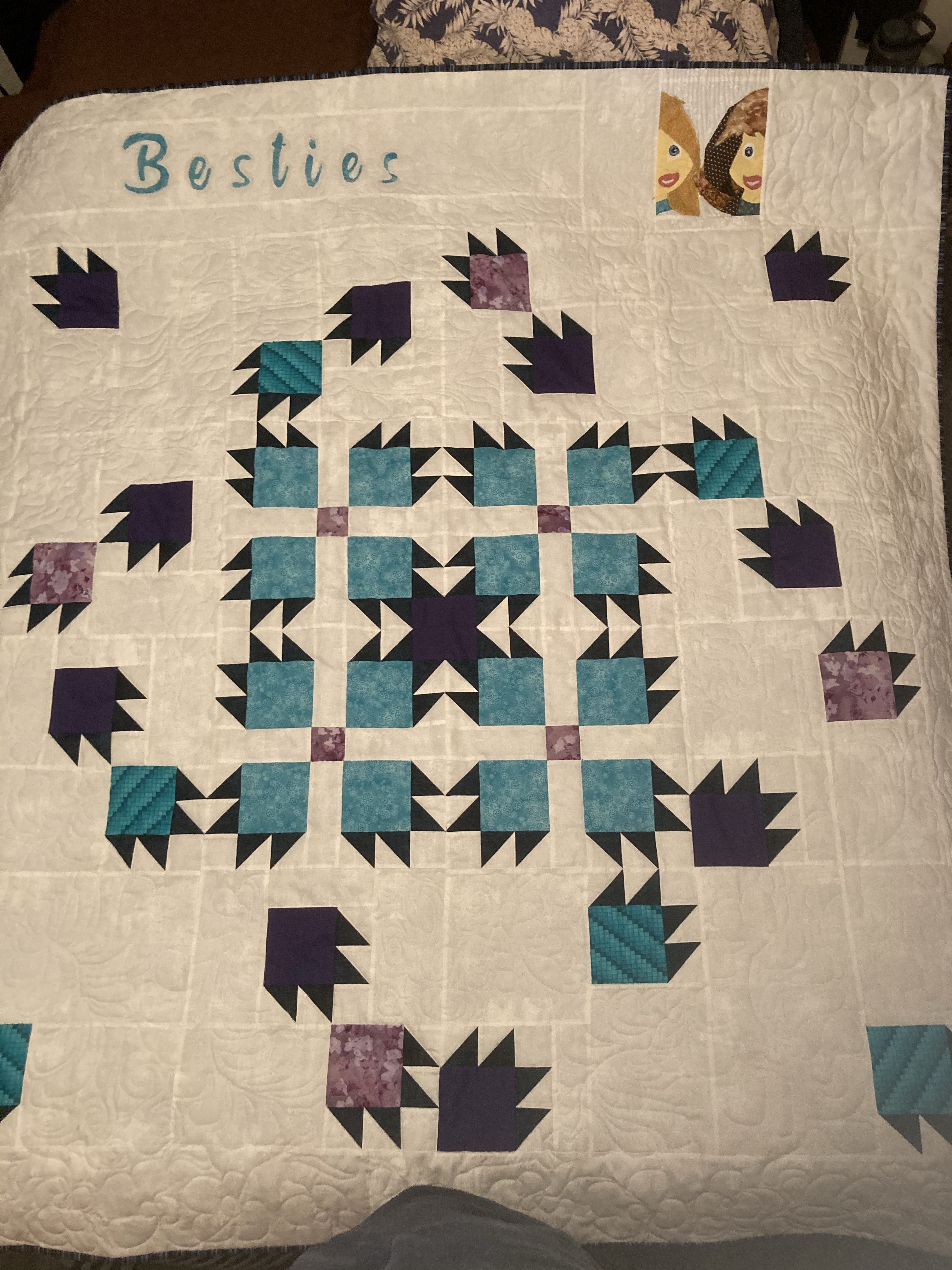 And here is my Waltzing with Friends quilt, quilted, threads buried, binding hand sewn and in the mail due to arrive the same day my granddaughter gets to see her best friend 😉