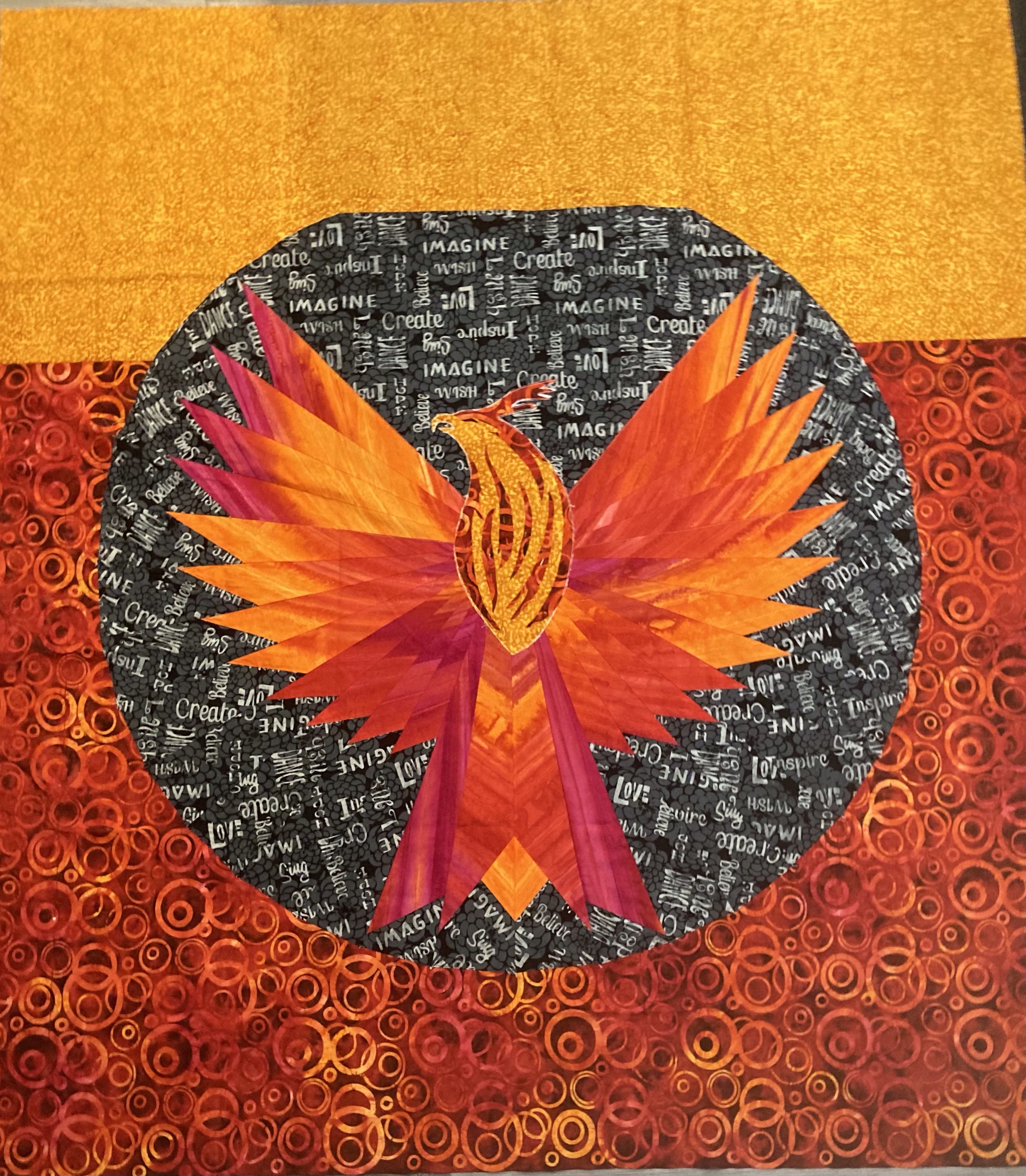 I love all your quilts, but Phoenix Rising is a sure eye catcher. You are doing very well on your PhD!