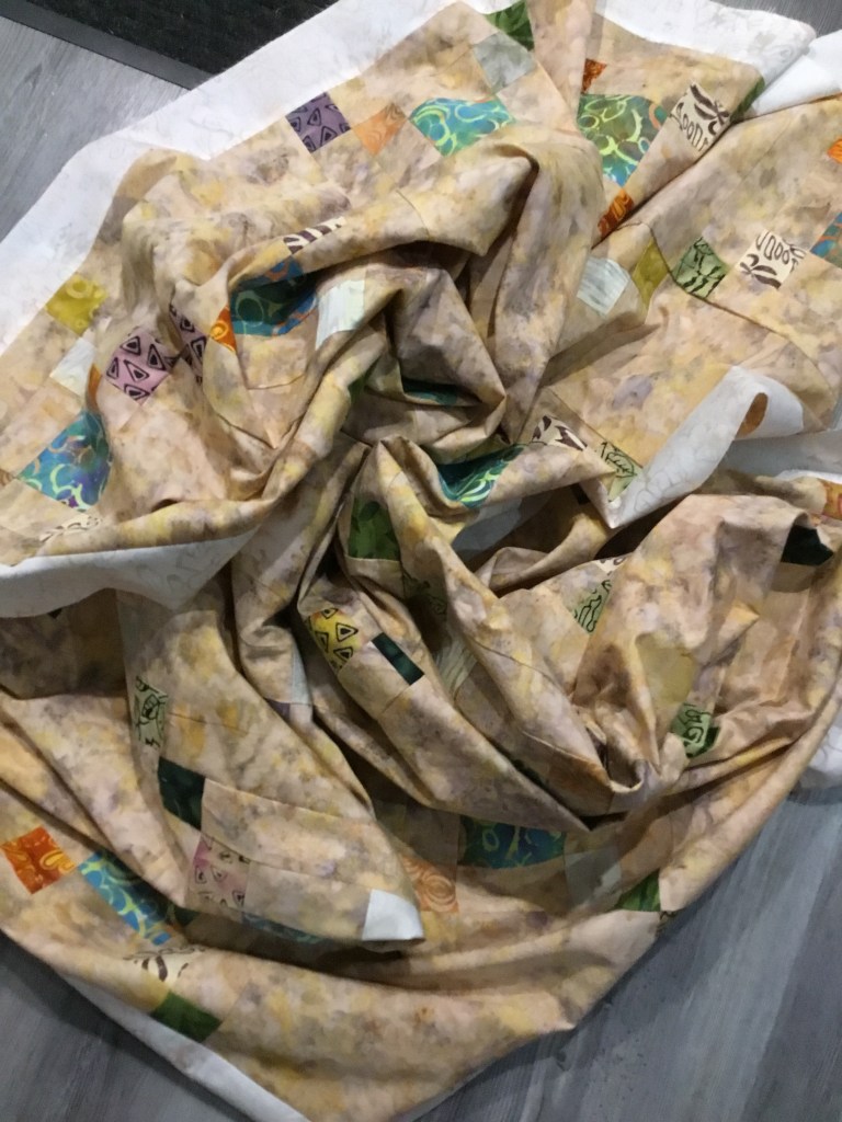Great fabrics!!! I’m sorry that you didn’t get a “finish” picture, but I’m glad it went to someone who needs a quilty hug! Thanks for making it! 🙂
