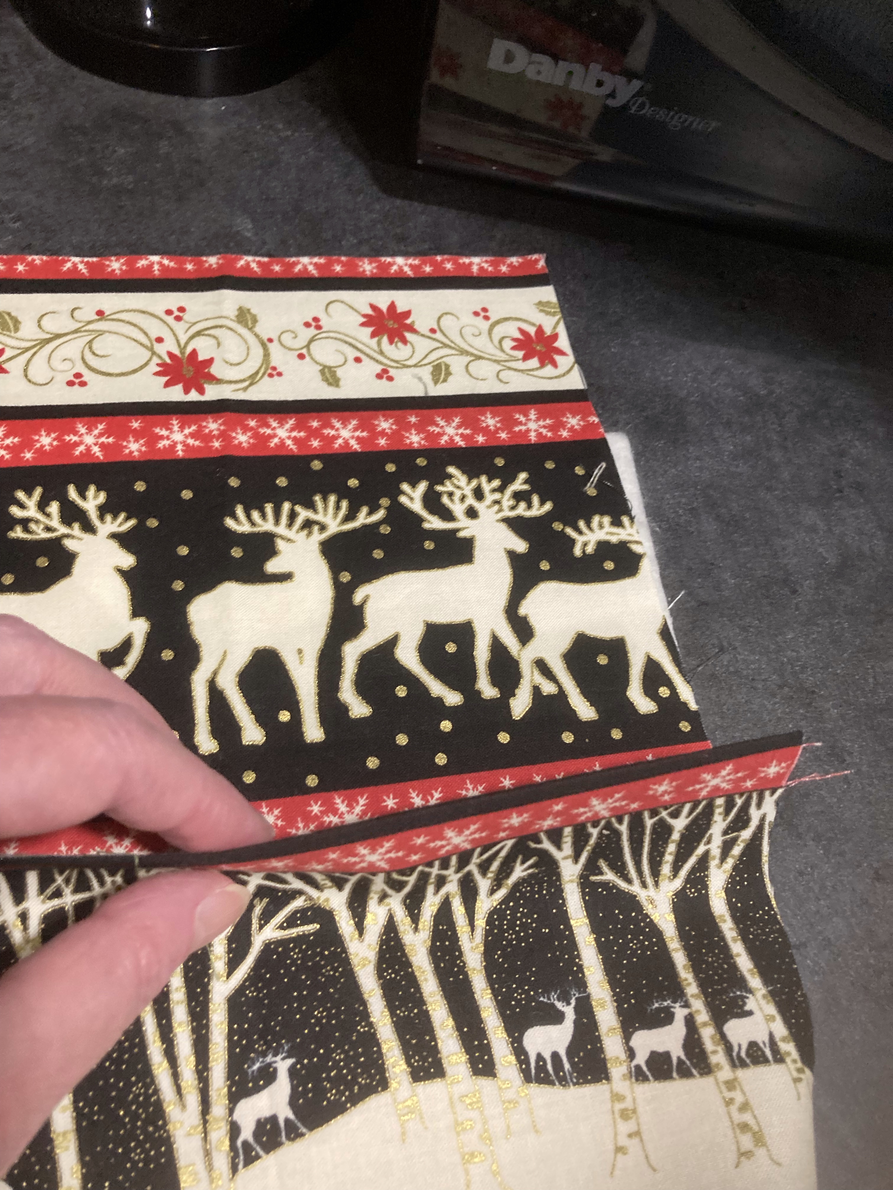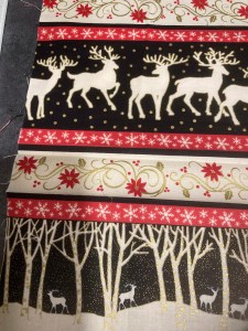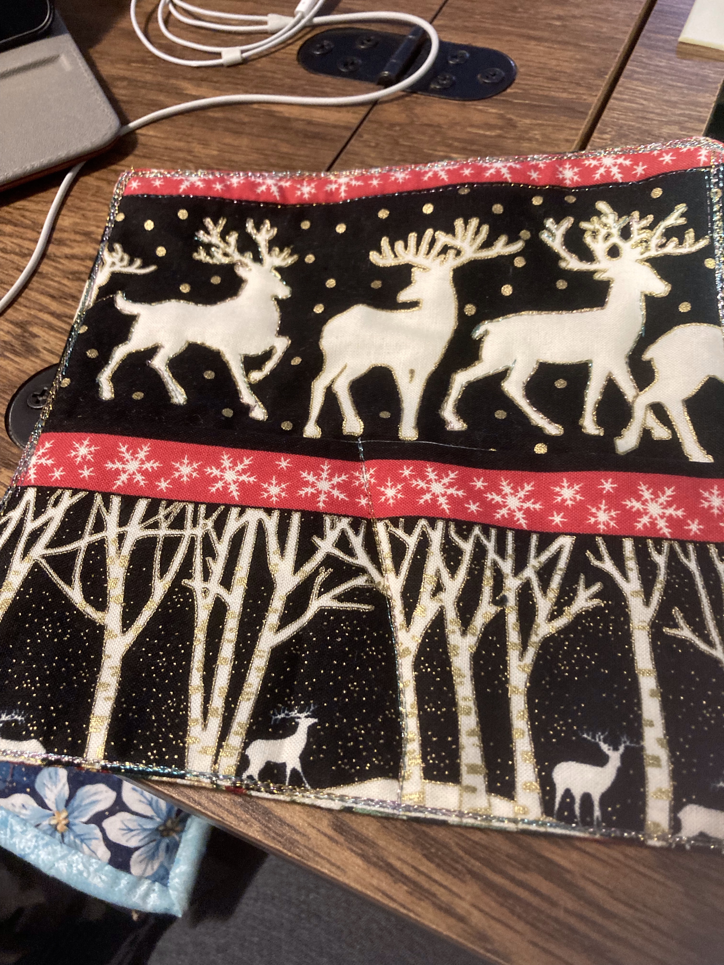 Once I turned it right side out and pressed it, I changed up the thread in my machine to a sparkly, metallic thread and stitched around the outer edge (after pressing the open edge to make a nice seam) and did some outlining around a couple of the reindeer.