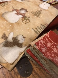 The colour for the RSC for January is red. For the first bit of scrappy fun, I found some leftover bits of flannel with fun snowmen and winter themes on the bits and pieces.