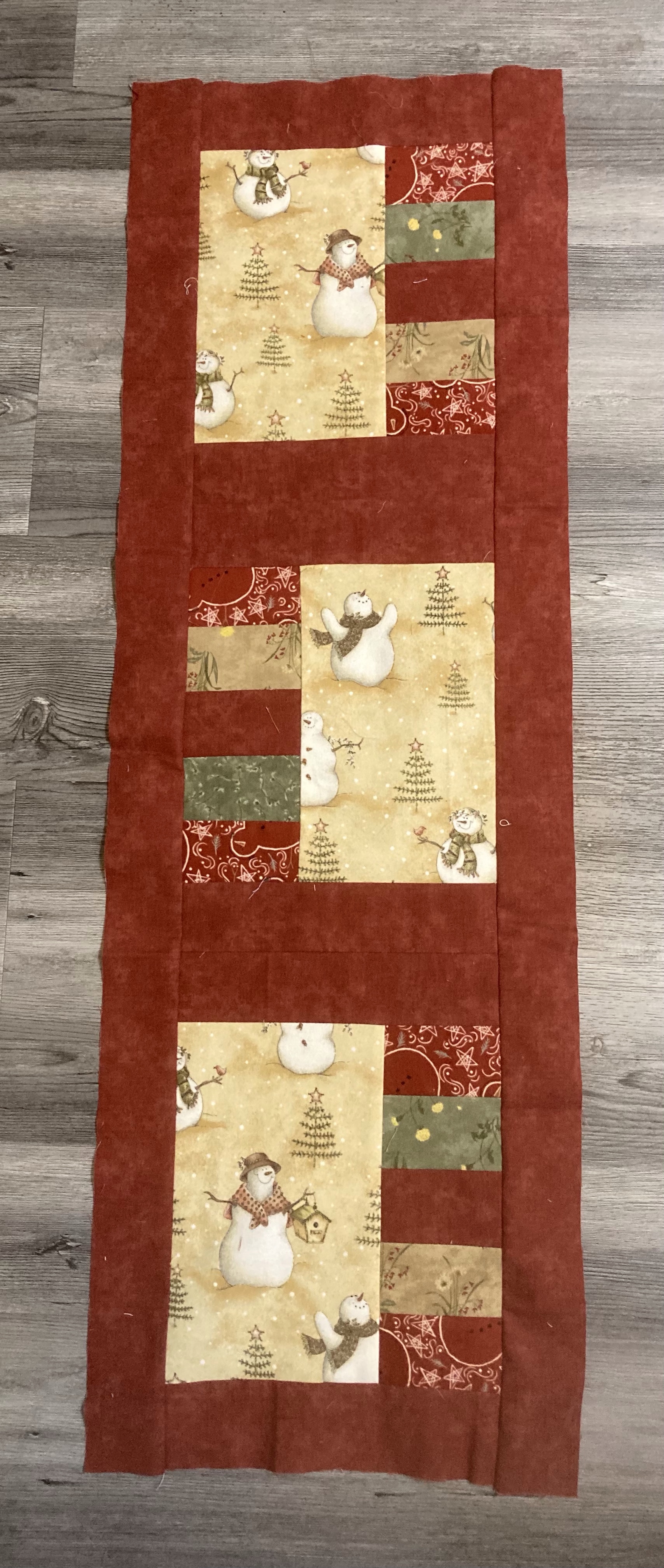 I started playing with these sweet bits and pieces and came up with not one, but two fun, winter themed table runners which meets my commitment to the Table Scraps Challenge (the theme is snowmen) for the Month. 😉