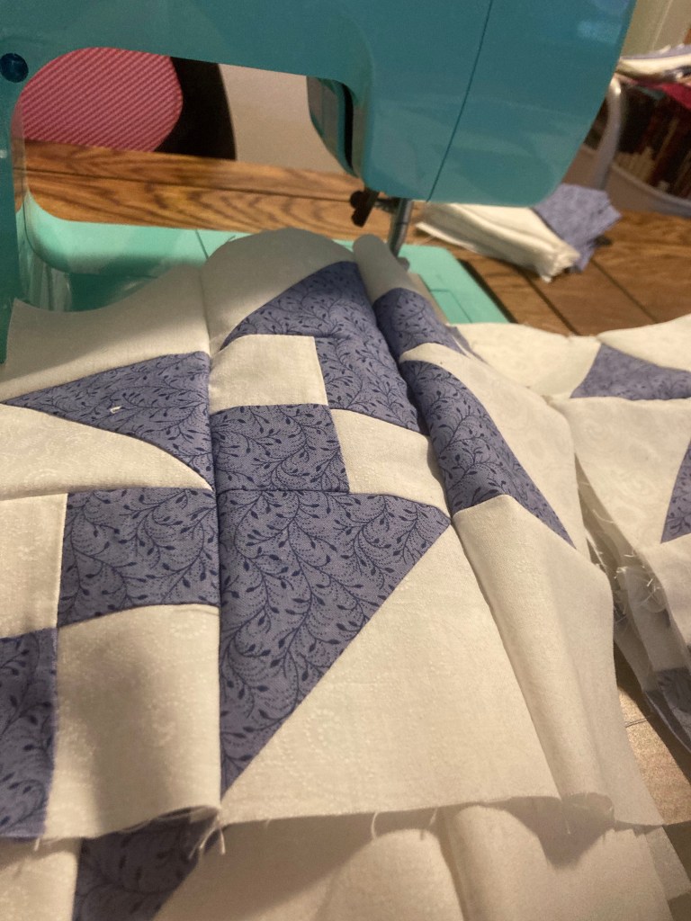 This flimsy has now been added to the TBQ bins with backing and binding tucked in with it. It’s not on my UFO list because I’m hoping Winter Blues will be one of my 2022 starts/finishes. 😉