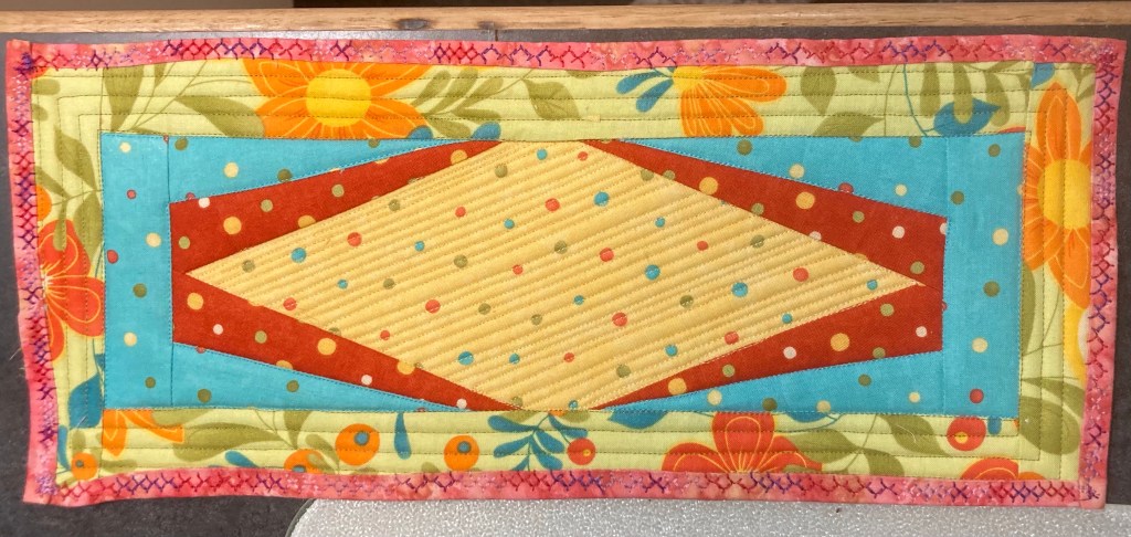 Then I was talking with my granddaughter to see if she has any word yet on her medical appointments. She asked me if I could make a little runner of a specific size. Her dresser has a built in shelf. It’s the one she puts her jewelry on at night, but often has the jewelry knocked around and has managed to lose some earrings. I asked her to measure the shelf and got to playing with some fun scraps in happy, bright colours.