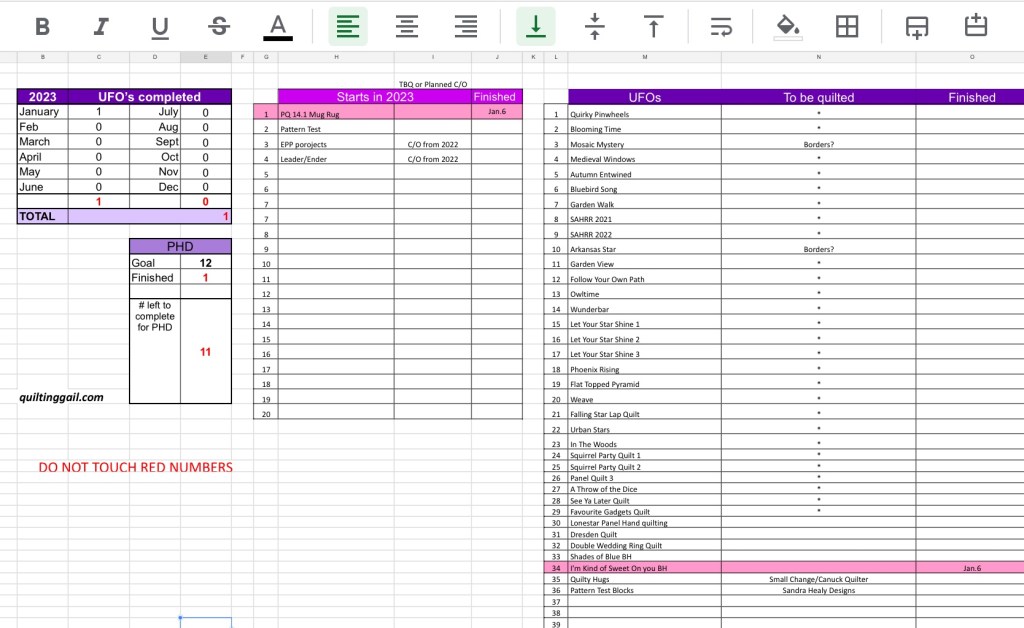 I was so happy to see Gail is doing it again! Her PHD Challenge keeps me thinking of my UFOs and trying to get at least 12 of them finished. 2022 was derailed for me with losing my great granddaughter, Clarke and then helping K and D with all that was involved when he was diagnosed with Mesothelioma and then passed away in September.