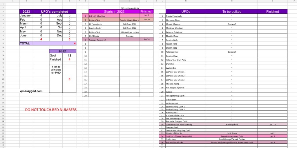 I try to start the year with a new list of my UFOs and WIPs. Quilting Gail created the perfect tracker and challenge to help with keeping my projects organized. It sure works for me: