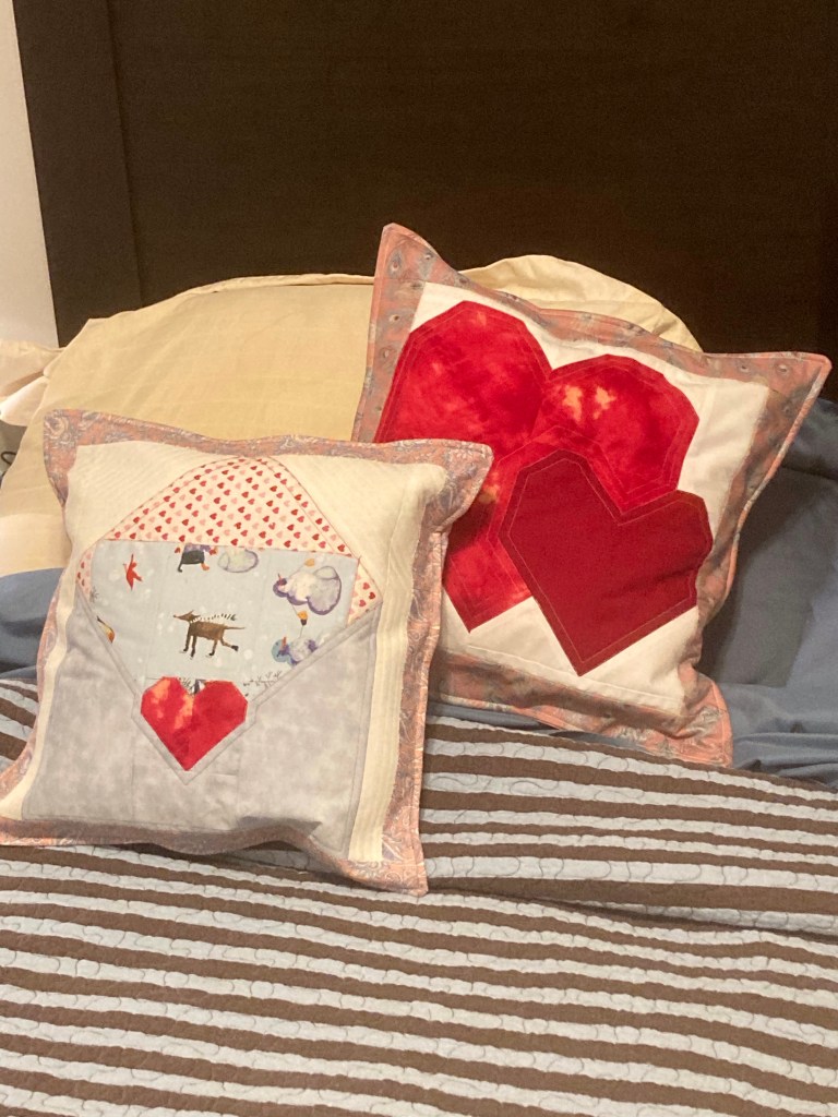 In return, my focus has been on making him some new cushions. He spends more time sitting in his recliner over the winter and often finds he can’t get comfortable. I indulged in a new craft for me; embroidery to stitch a design on one cushion. Then I used a couple of blocks I had tested the patterns for and made another two cushions.
