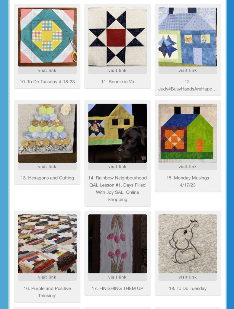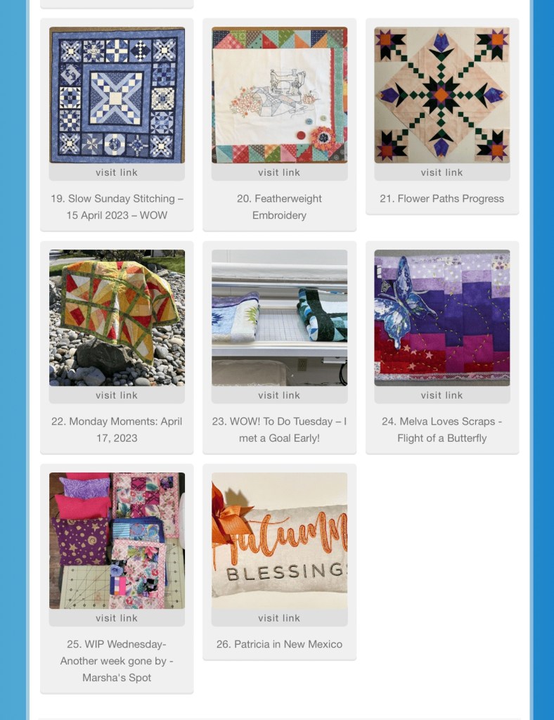 There were 26 quilters link up to our party last week. I’m happy to say I was able to visit almost everyone and was impressed with the progress everyone made on all of their projects.