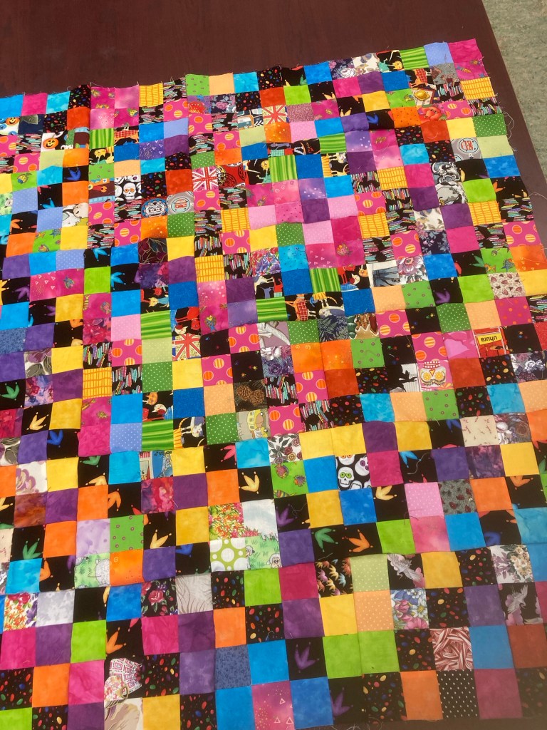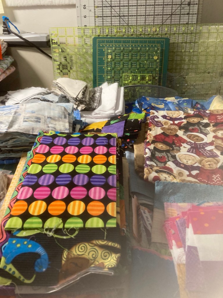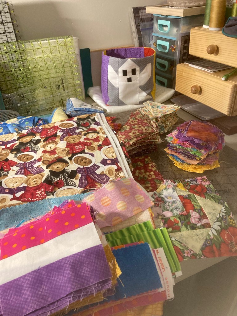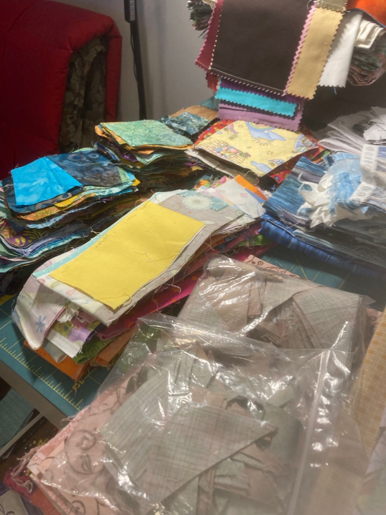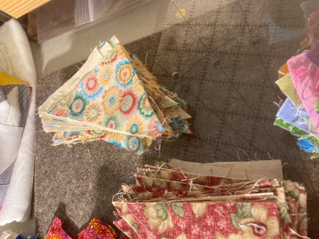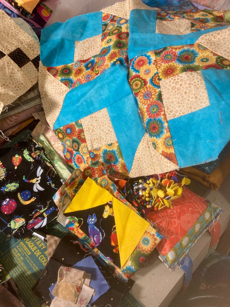 4. Work on what ever catches my fancy or my inner squirrel, Samantha, brings to my attention. 🐿 I’m happy to say I’ve been sidetracked by a couple of boxes from Denise with orphan blocks, abandoned projects, scraps and lots of ideas!