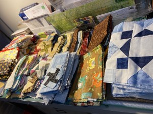 I’m including a gallery of photos to share some of the fun little blocks, bits and pieces and fabric that Denise sent to me, that I’m working playing with to come up with some new quilts for an upcoming charity event;