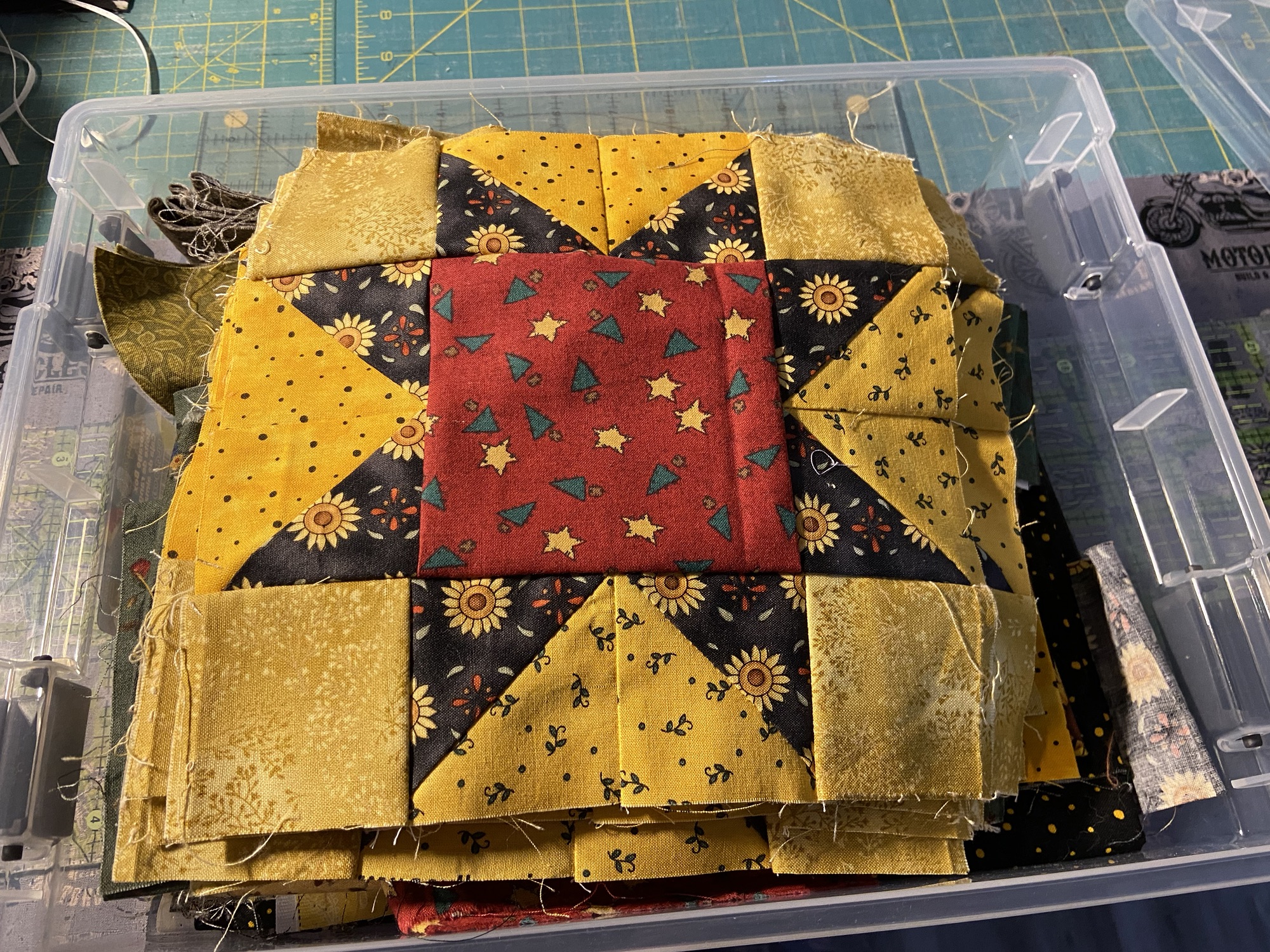 I’m including some photos of my project bins filled some of the fun little blocks, bits and pieces and fabric that Denise sent to me, and my orphan blocks and fabric from my stash, that I’m working playing with to come up with some new quilts for an upcoming charity event;