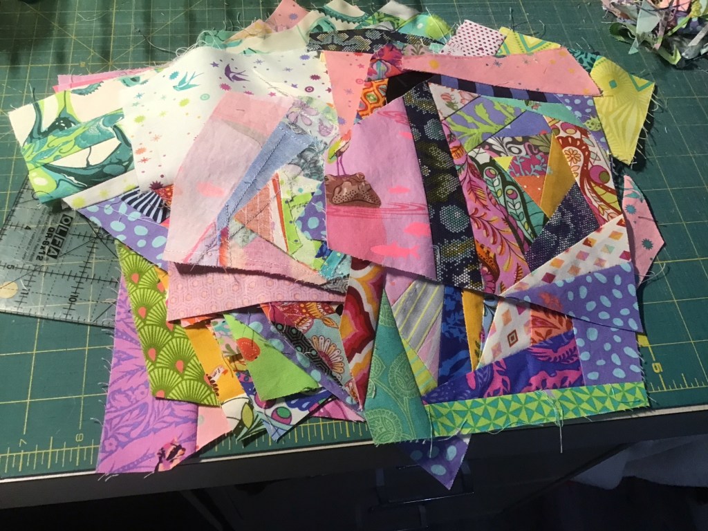 4. Keep playing with the orphan blocks and goodies from Denise and the Tula Pink scraps from Monique, with some additions from my stash, to use up more bits and pieces until those project boxes are empty. I have not had any time or energy this week to put needle or thread to work.😁