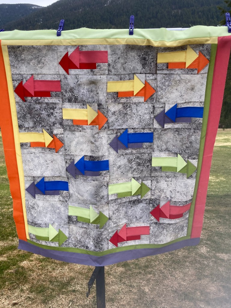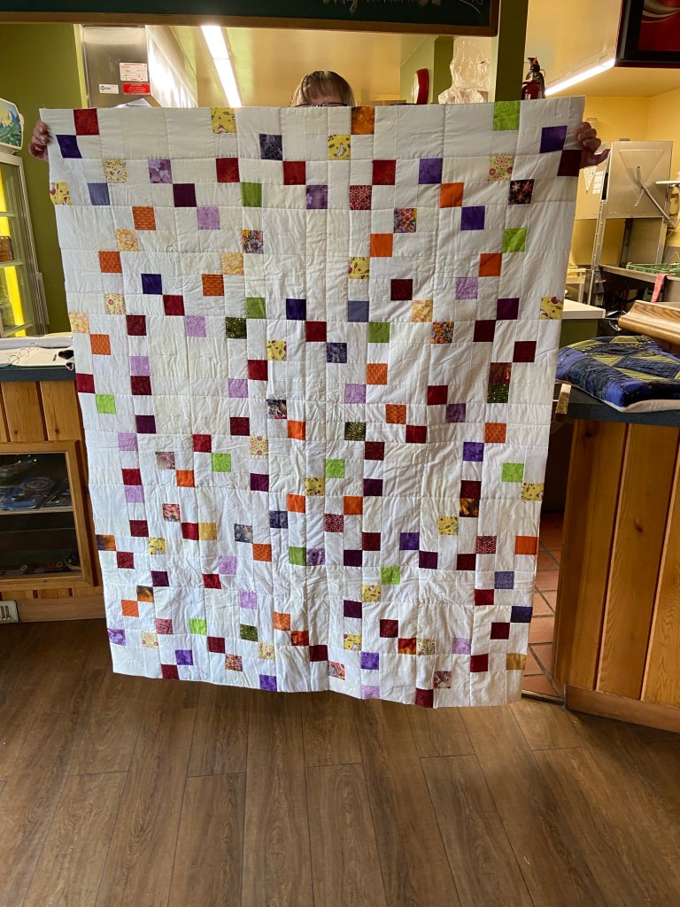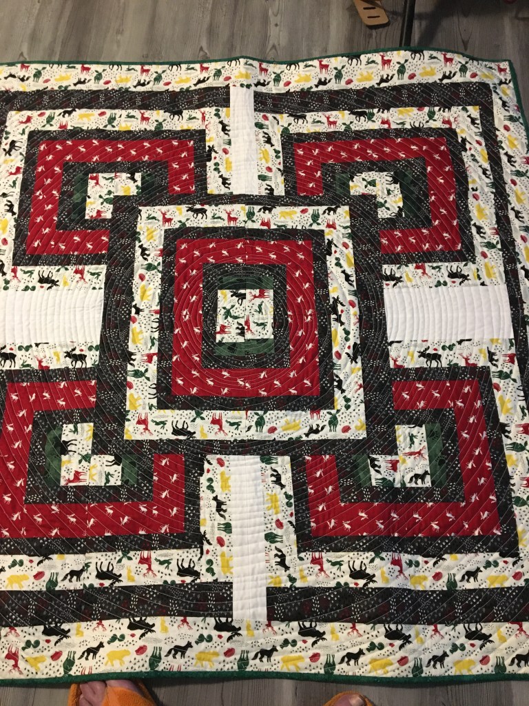 Each of these quilts are larger than most throws or lap quilts since I keep thinking of a young Mom I met this past summer at the Resilliency Center during our horrendous wildfire season with 3 nearby towns evacuated. She has three littles under five and doesn’t have a lot of money. We were talking about life here and crafting and hobbies. She is a knitter and I mentioned being a quilter. She talked with fondness of a quilt she had when she was younger that her grandmother had made. She said one of her favourite memories was snuggling under that quilt with her mother and brother on movie nights. She does the same with her kids. She mentioned having gone to the Christmas dinner and that she was disappointed by being too late to choose one of the quilts that were there among the donated gifts (quilts, knitted hats, scarfs or shawls, bowl cozies, mittens,gloves, hand warmers, etc. all made and donated by crafters in our community) t