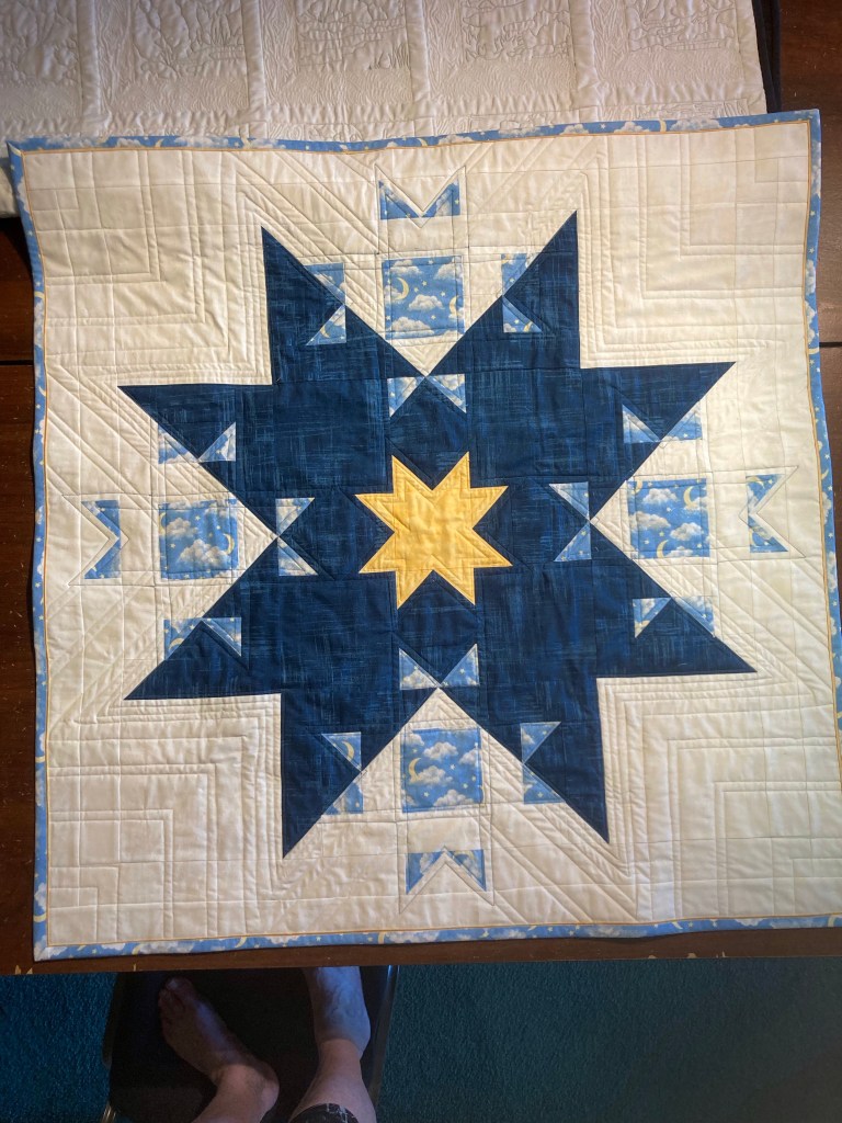 So far I do have some finished quilts and several that just need the binding. Each of these were quilted with straight line quilting on my last trip to the studio. It’s not fancy but is quick to do on the long arm, and it works to stabilize the quilt and lets the quilt pattern be the focal point. Who doesn’t like stars, random confetti or plus signs? Here’s a gallery of this year’s quilts that I’ll be donating: