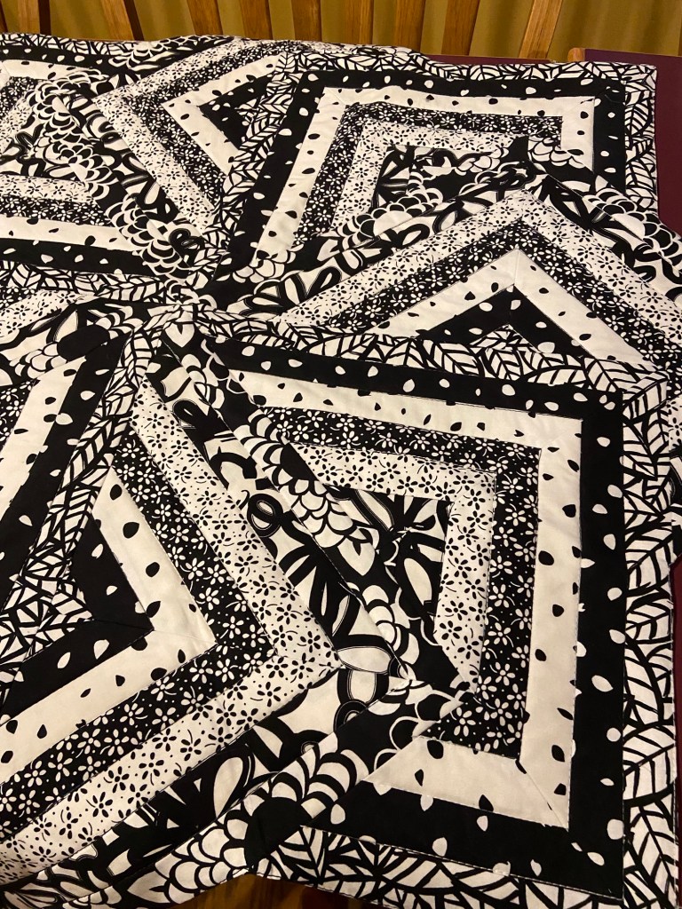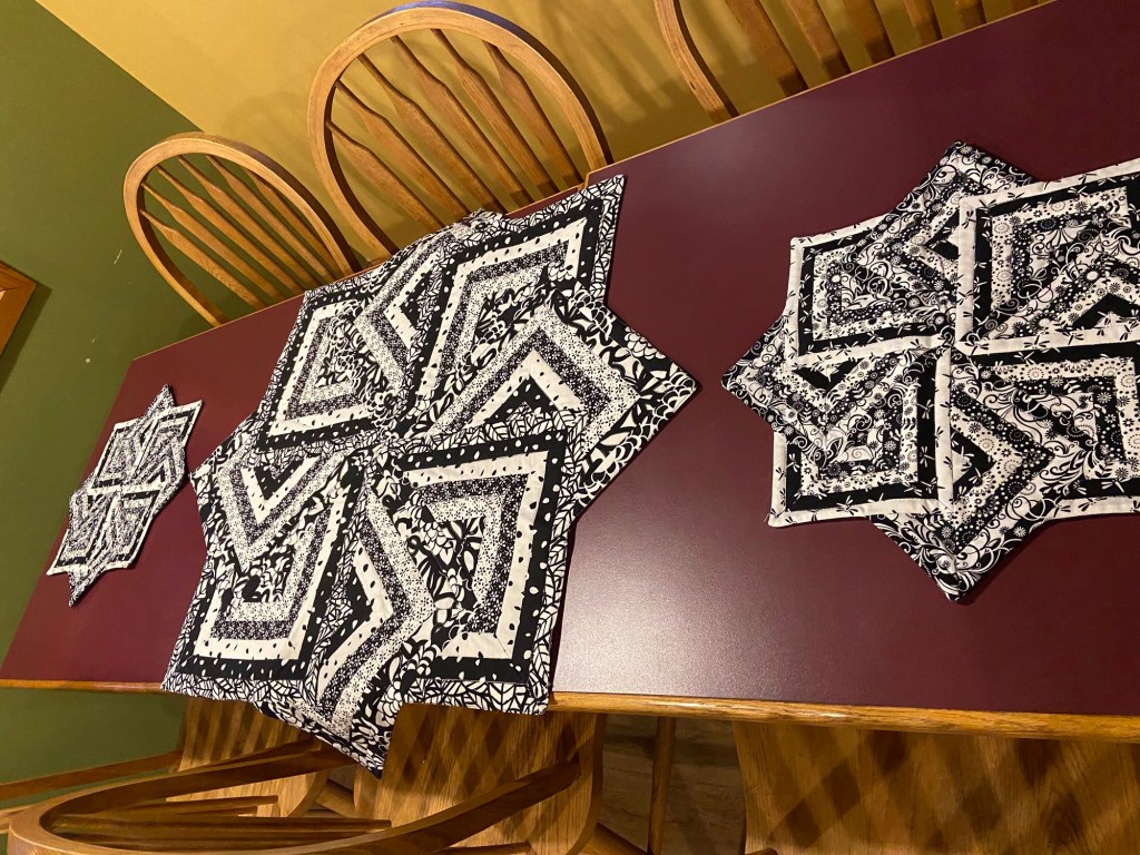 I don’t usually do a lot of seasonal decorations, because, well, you know……the husband. So I had to come up with different ideas and the first one was inspired by the logo and a favourite daughter in law’s color preference. this daughter in law has a huge dining table in the farmhouse. She is somewhat old fashioned and uses tablecloths, runners and even cloth napkins every day. I’m lucky enough to have this amazing women for a daughter in law because she encourages and appreciates my quilty gifts. I’d not made her a new runner for a while and had seen a photo on line that had me intrigued. Out came my black and white scraps (and a few fat quarters if I’m honest😁). I had to work from my memory of the photo (no I hadn’t saved it 😳) and had to start over or get Jack out numerous times, but I’m so happy with the wickedly complex project.