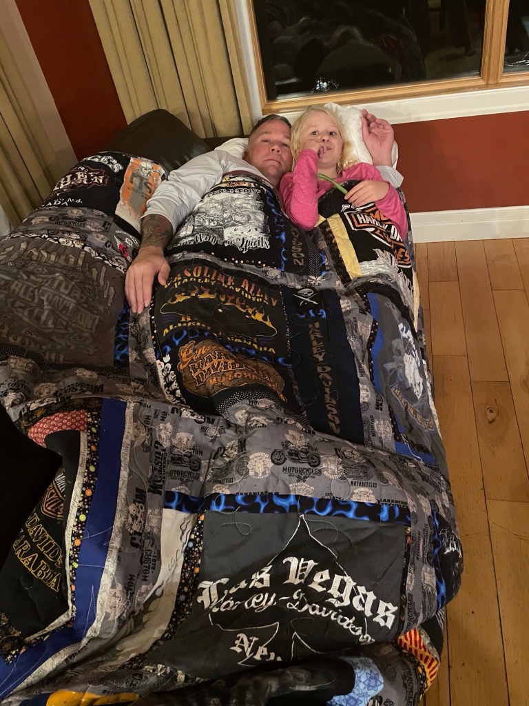 3. Finish the memory quilts for my son and granddaughters from a collection of T-shirts from my son, DIL and granddaughters and our Clarke’s clothing. I finished the binding on the first of these quilts. It’s in the photo above! 😁