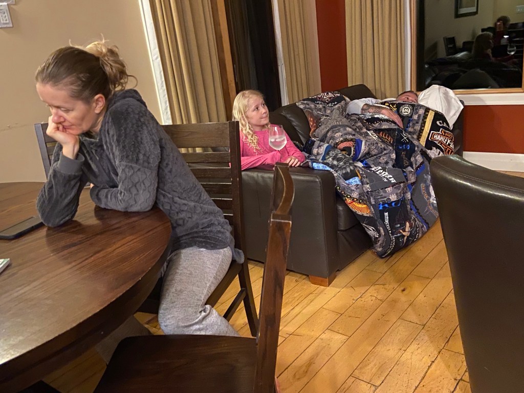 I can say it was a very productive, fun filled week this week. I attended my meetings, got DH to all of his appointments and had lots of stitching time even though I took Wednesday off from fabric fun. I was up early and went to town to pick up DH’s meds, dropped them off to him and then headed North two hours to the hot springs to visit with my son, DIL and two amazing granddaughters! We got to visit, soak in the hot springs, eat an amazing dinner and play board games with the girls. The youngest had some snuggle time with her dad since they had a new quilt to cuddle up under.