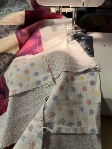 8. Continue fixing popped seams and stay stitching the edges of the next bin of quilt tops for Liz’s project.