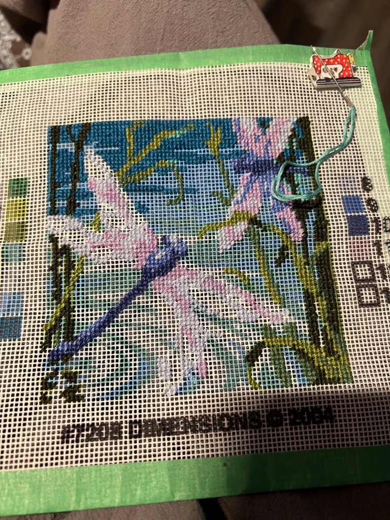 2. Keep hand stitching in the evening doing my EPP and the needlepoint kit. I’m on my last colour of floss on the dragonfly piece. 😁