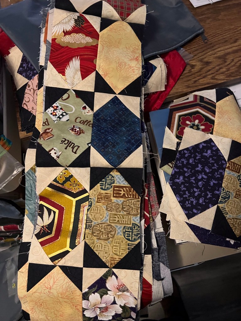 3. Finish making my quilt top from my crumb blocks and leftover panel blocks. Still working on the sashing/lattice strips. 😁