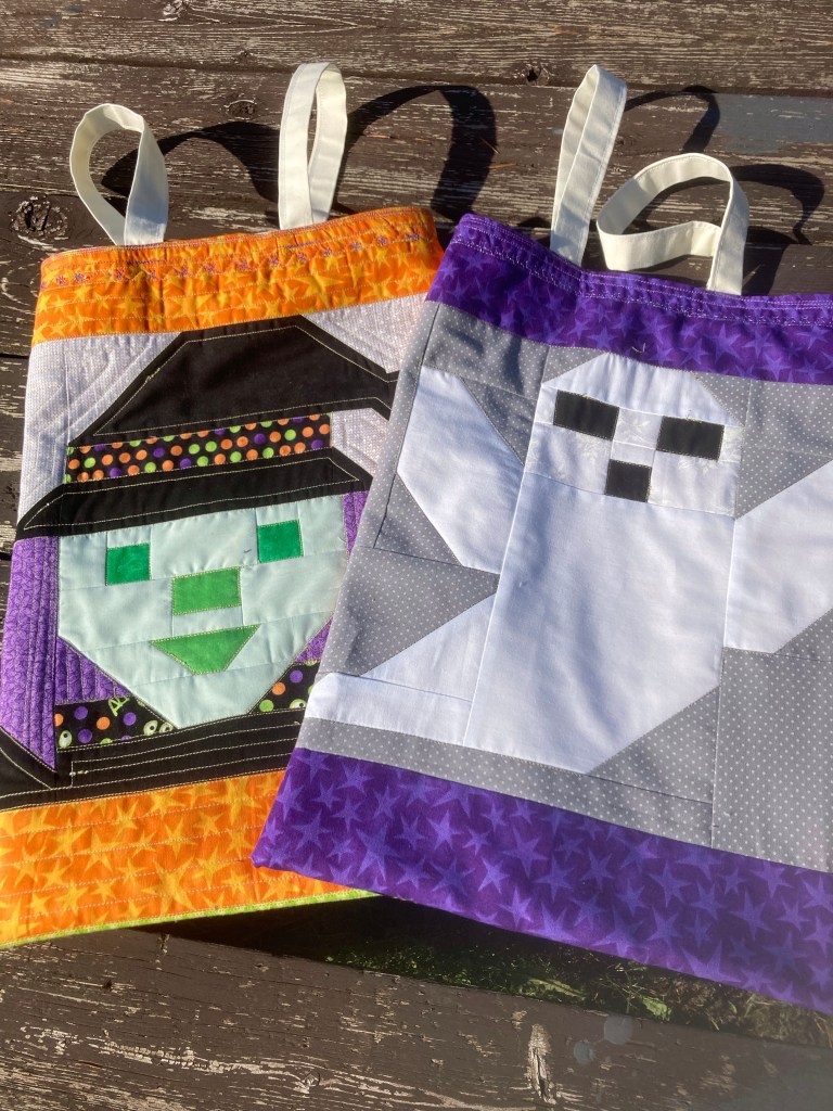 4. I love you batty window hanging! I always love that stained glass effect from a quilt. Adding the eyes was a perfect choice. Love seeing all the bags and blocks you made too…such fun halloween treats for the grands and for you!