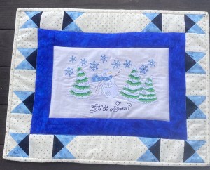 A table topper made with a machine embroidered panel. It suits my mood these days because I am so ready for the snow to fall.
