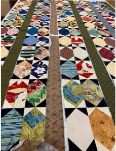 7. Get the quilt top finished using stash fabrics first sashing along with the blocks I’ve made from Denise’s donated bits from the Treasure boxes she sent of goodies changed my mind on the sashing strips on this one, too