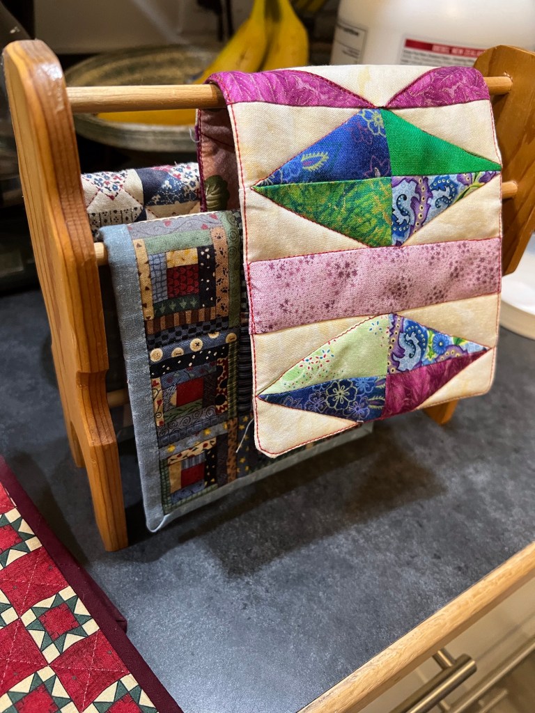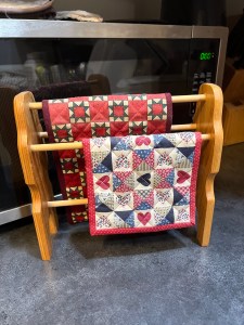 I’m sure we all have items in our sewing spaces that have treasured memories attached to them. This mini quilt rack was gifted to me by one of my students. It had belonged to her Mom and each of the little quilts were from printed material.